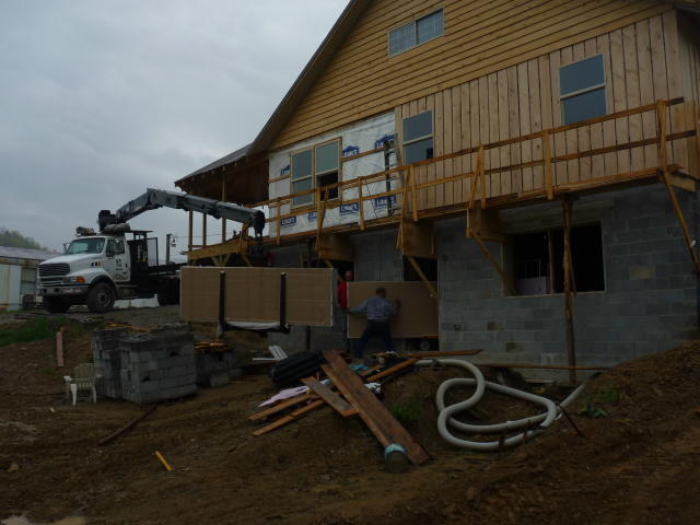 Insulation going up. All of that is done now. The drywall contractors on the job hanging some up. Siding on the back and the high end of the house is done.