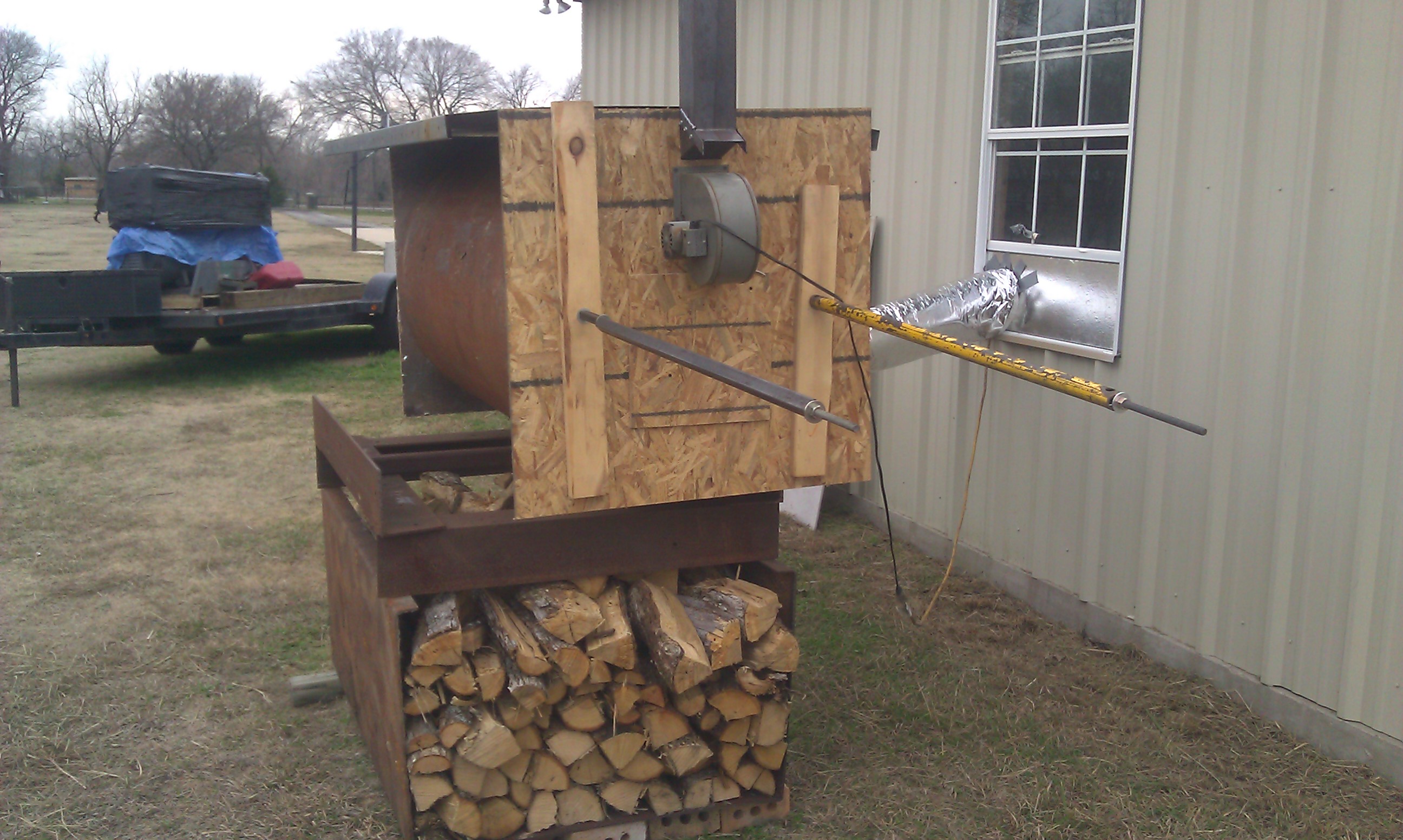 I needed a way to heat my small workshop without having a open flame inside it. I am hoping to be able to spray some paint in there and still be warm. My solution was to combine a old double wall wood stove with a heating oil tank to make a outside warm air furnace. So far it has worked real well. I still need to make some more modifications to add more safty into it such as an insulated chimney and a heat dump incase power goes out. Let me know what you all think good or bad. I am defintally not an expert with heating with wood but figured this would work so I gave it a try.