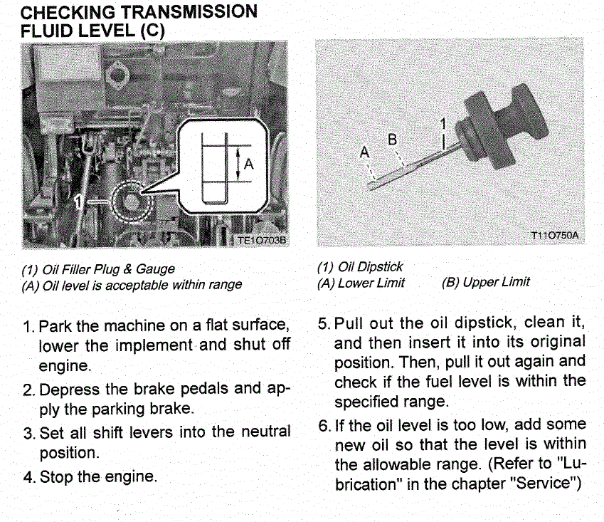 On my DK45 i didnt know about the drain plugs on the rear axles and i only drained the main plug. The manual didnt even show the other 2 drains or tell me i had to do it. I found out about them from another member on this site. The dip stick on mine is notched ay low and high levels.