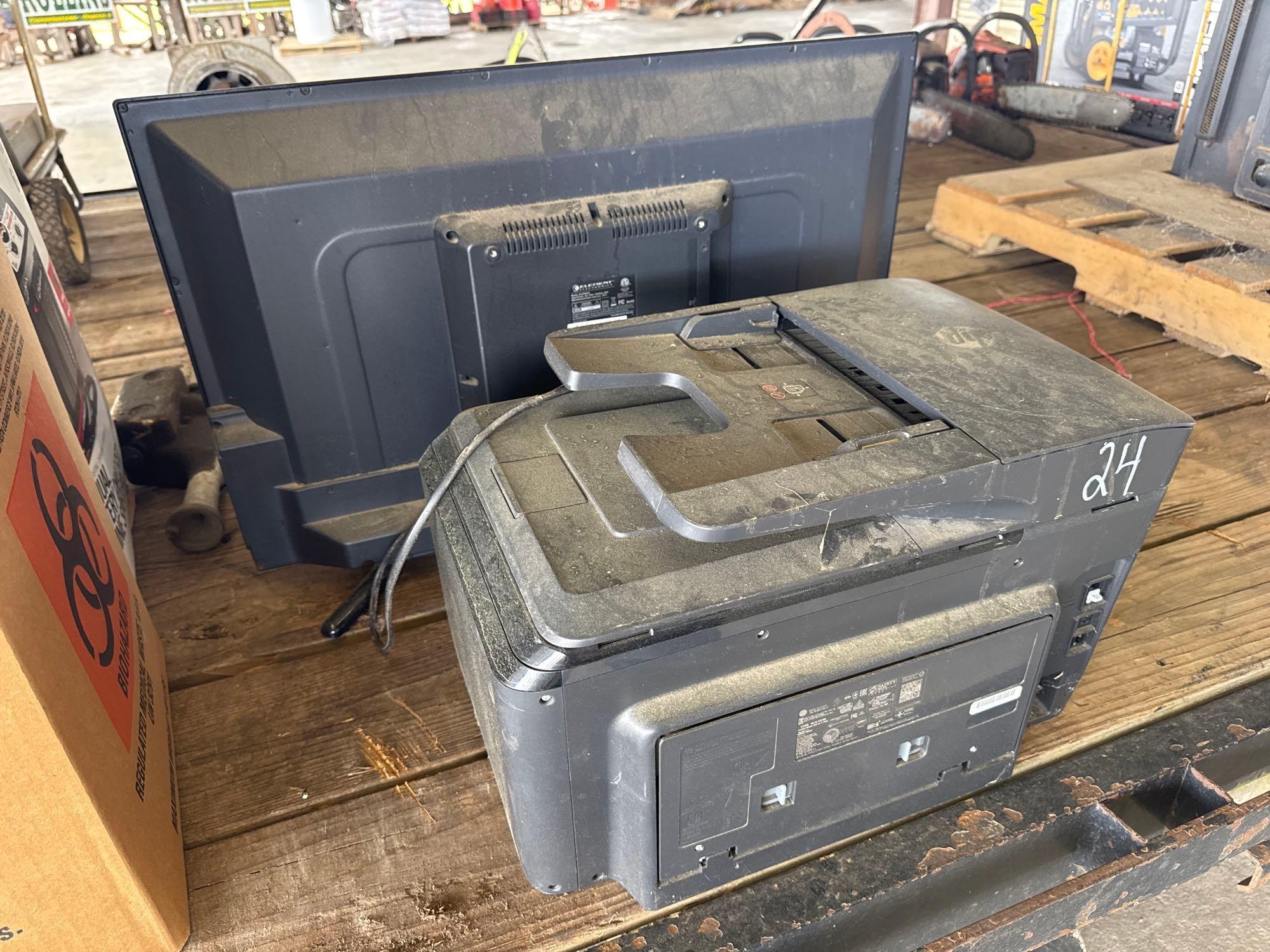 OVERHEAD PROJECTOR, HP PRINTER, (2) MONITORS
