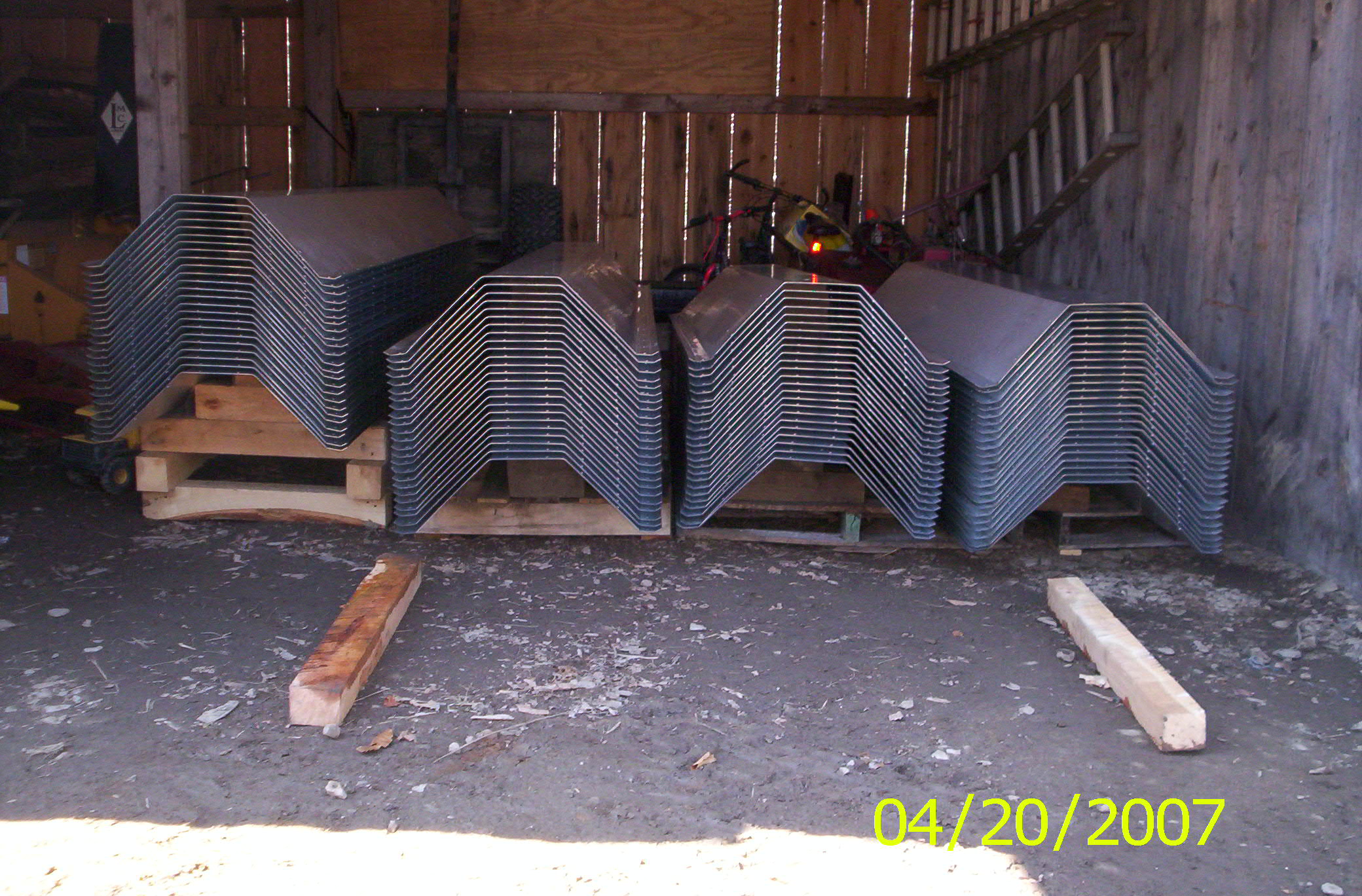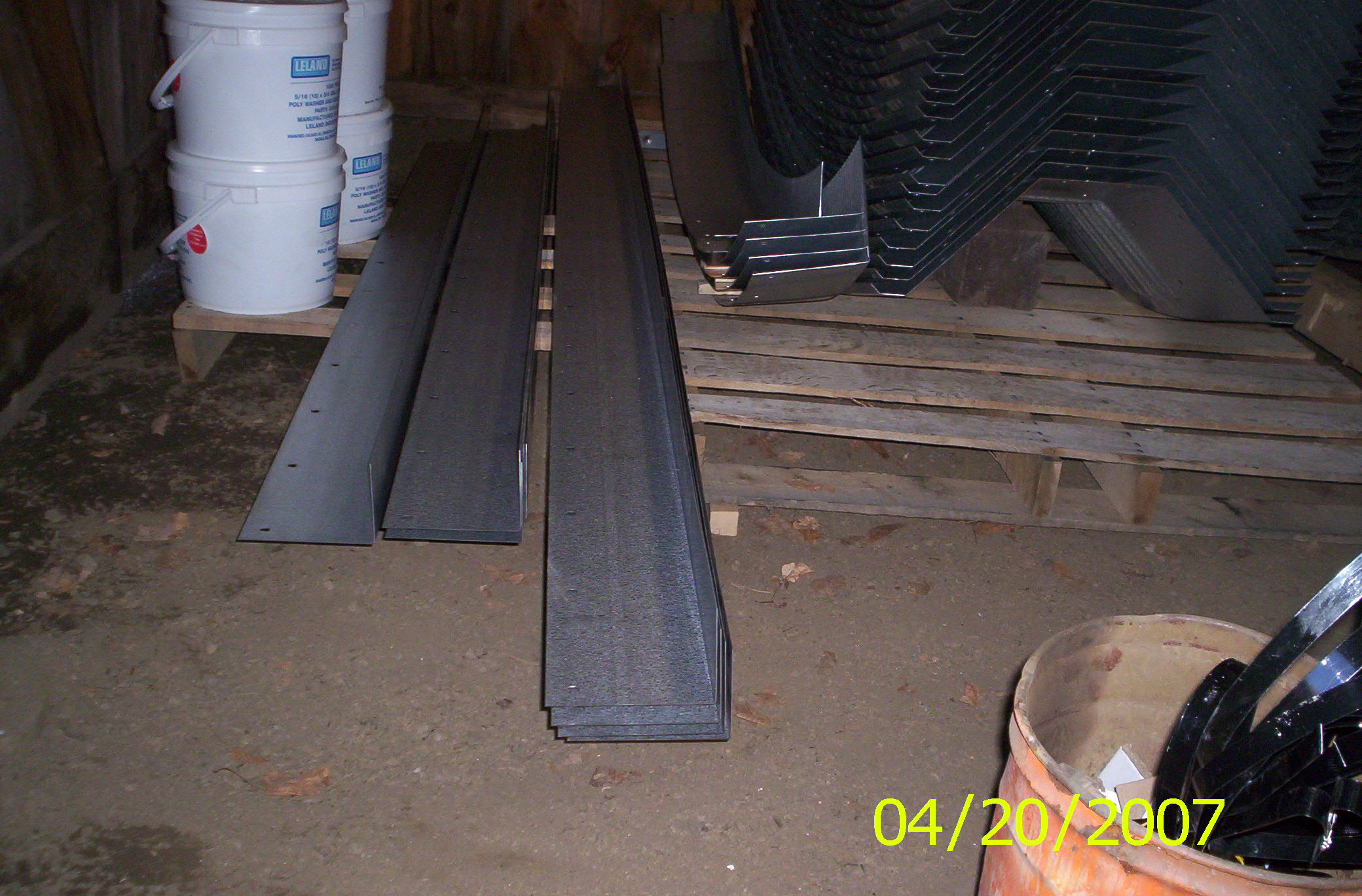 took delivery of the building 2 pallets 6000lbs had to split them up onto other pallets so i could pick them 1500lbs max. i was amazed my whole building plus two others was on one 16' straight job truck. 1st pic is all the straight panels.2nd pic had to cut spacers to put between each panel to let air in.3rd pic not to good. eve,peek,panels, end wall trim angles, & buckets holding 5000 thousand nuts & bolts.