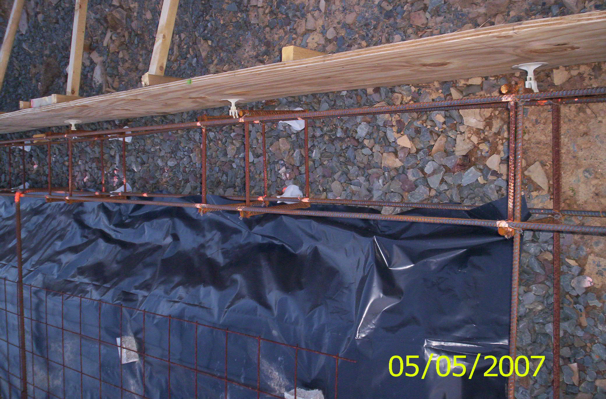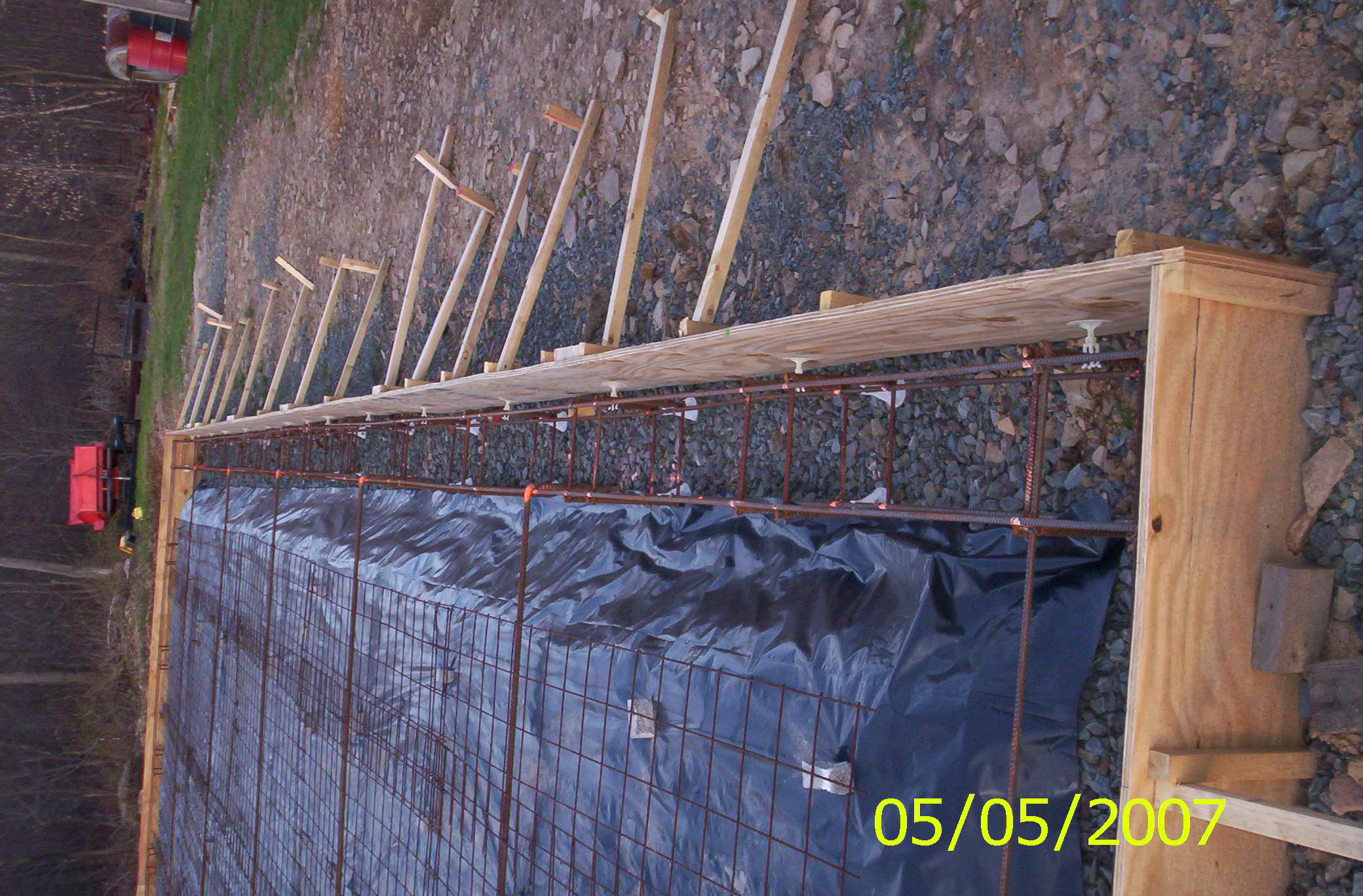 took some thinking & many tries to get the panels 2' wide up to 10' long to stay standing in stacks till we were ready for them. these next pictures show the foundation forms all the rebar,wire,vapor barrier,stone. unfortunately no pictures of moving stone. i would be away from home all week & have stone delivered so when i got home friday nights 11:00 or later i would jump right on the tractor and get to work to dark for pics, plus this was stuff i could do myself. so when the help showed up at daylight they wasnt waiting on me this way i could work on the otherthings in daylight. it took 115 tons of stone i was in my glory moving that,lots of seat time. it took a little over a month just working weekends to get it ready for concreat. only my wife & dad helped me get it ready. we had to make 200 1'x1' rebar boxes for the footers to tie all the long lenghts together. i cut all 1' pieces with a chop saw & the wife bless her & her blistered hands wire tied the boxes together while i am away all week. the one picture i had to use the box scraper with a jig i made to heat & bend hooks on 3/4 rebar that are used as tie bars to tie the load bearing footers together.
