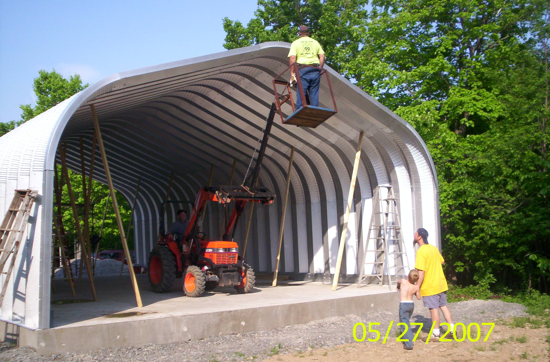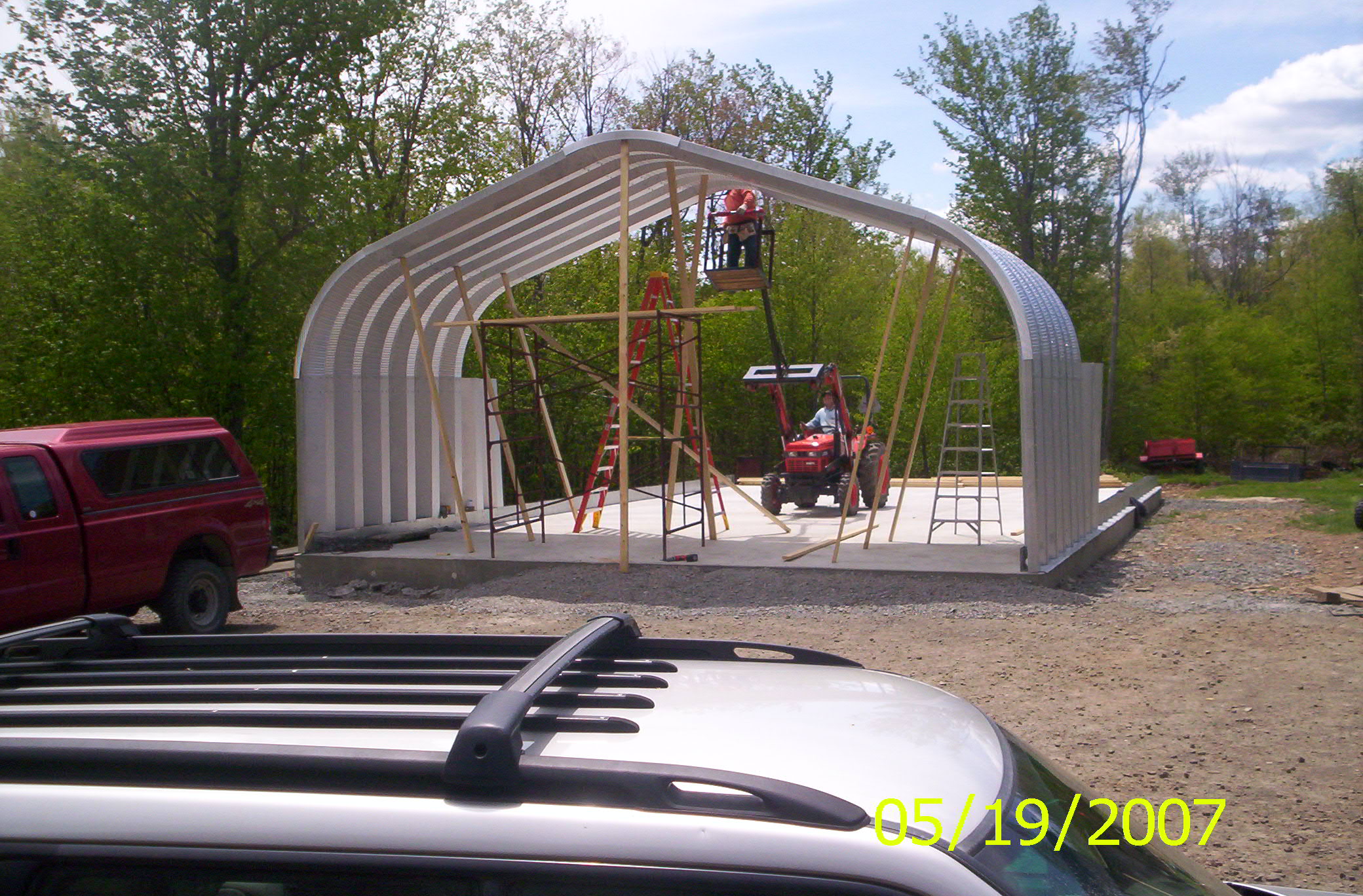 this is a 30'w-50'l-15'h arch steel building i put up this summer. the building is 80% done. i took some pictures as it went, wish i would have taken more not thinking about posting them on TBN. didnt see any projects on here with this kind of building thought some of you would be interested. the building pad was leveled a few years ago,before i had a digital camera.alot of the gravel/ tractor work was done at night so no pictures sorry. but i did use my tractor with a jib i built & man basket to put the whole building up. i have enough pictures of progress i think hopefully to keep you all interested.