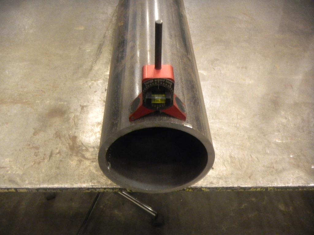 Do you have a center head? Mark center of pipe at each end, take a straight edge, or chalk line and make a mark from one end of the pipe to the other end. Transfer this mark to the opposite side of the pipe. You can even quarter the pipe if you want to.