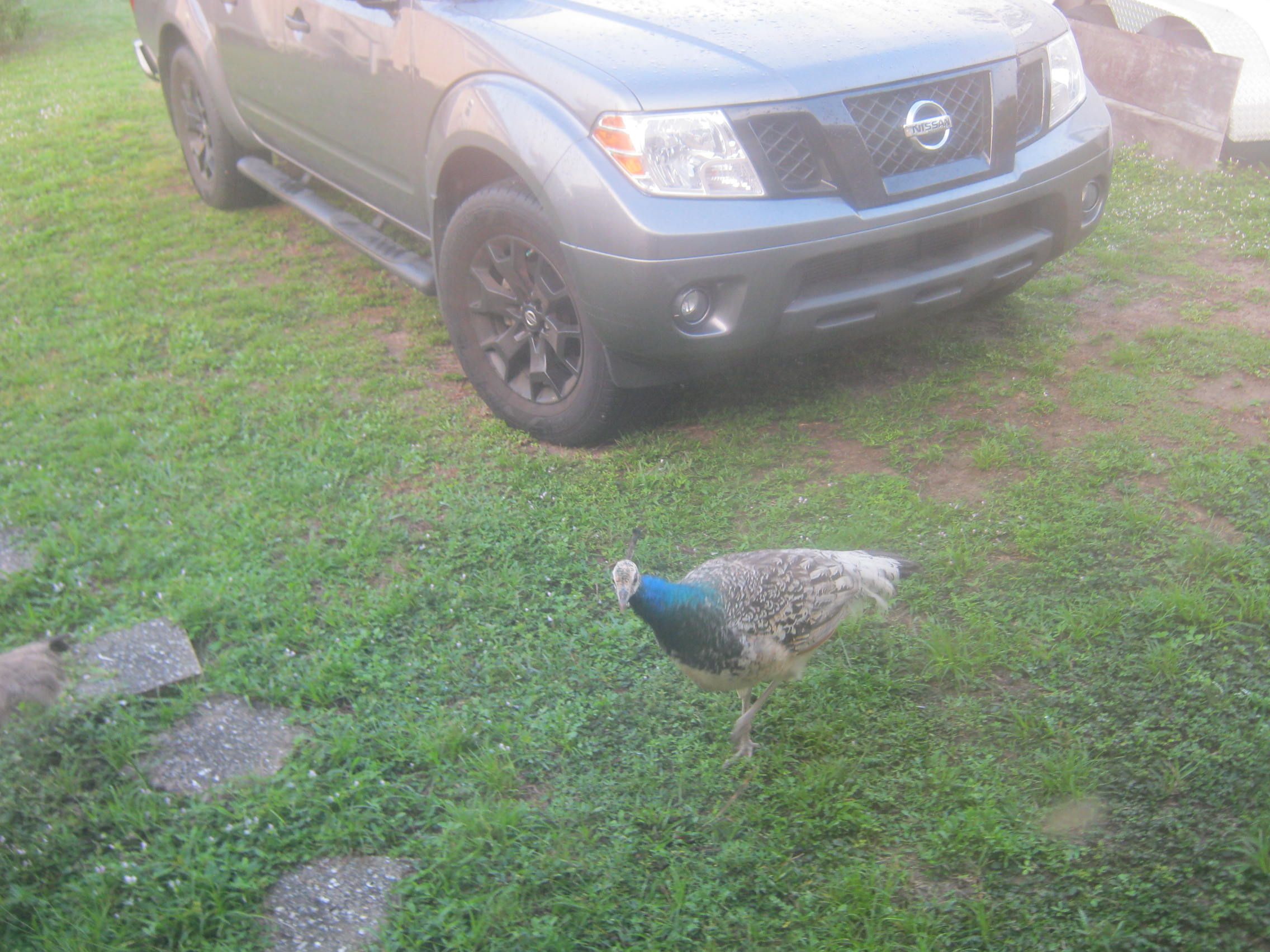 Hello to all , woke up this morning to six peacocks real close to back slideing glass doors . Once in a while we will get a giant one cruise through property . We have no idea who's property they have wandered off from . The larger ones with real super long feathers are beautiful . Most are blue , I believe those are the males (not sure have never goggled it) .