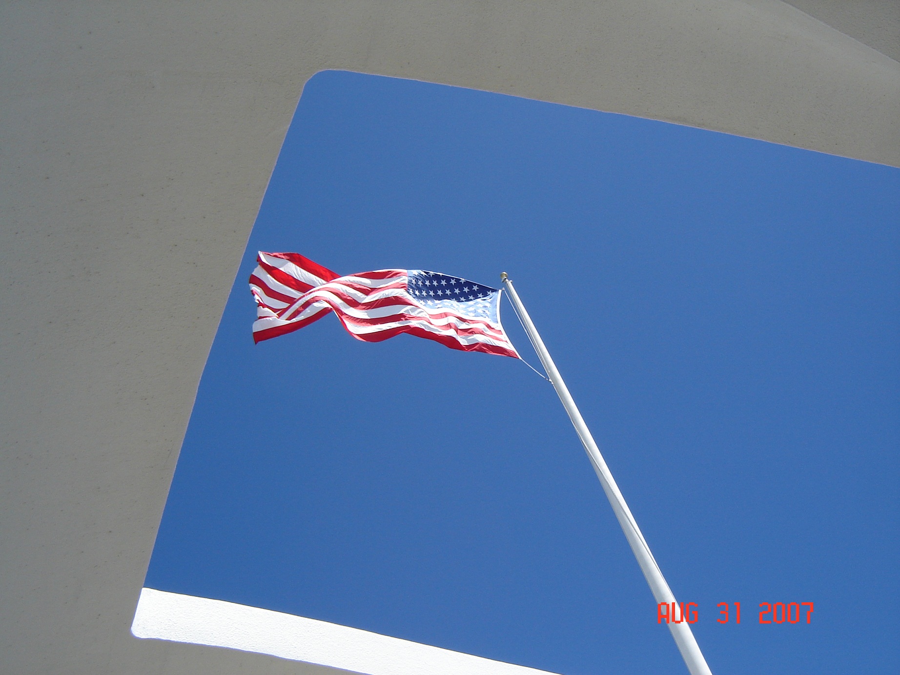 It's hard to believe that it has been seventy years since the attack on Pearl Harbor. My wife visited Hawaii a few years ago to visit her brother before he went to Iraq. I was not able to go, but I asked her to visit Pearl Harbor and take pictures for me. She took a lot of pictures but this is my favorite. It is looking up from the USS Arizona memorial. It makes me think about what happened that day seventy years ago and the men that still rest beneath that flag.