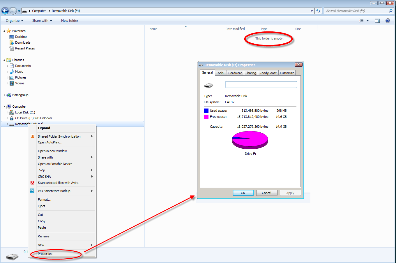 There are some other steps, but the first thing that might tell us something is to check the properties for the flash drive. You can see in this example that the drive appears to be empty, but apparently something is using up 298 MB of room. I've marked the files on the flash drive as "hidden", which is something that a virus might do. Is the amount of space shown as being used on your drive consistent with just one photo, or many?