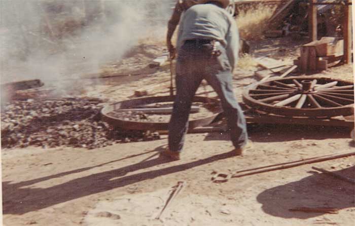 First the iron tire is heated in a fire. An earlier picture has the fire in it. Then forced over the wooden wheel. Usually a little hammering is required. The wood usually flames up, so it gets dosed with water.