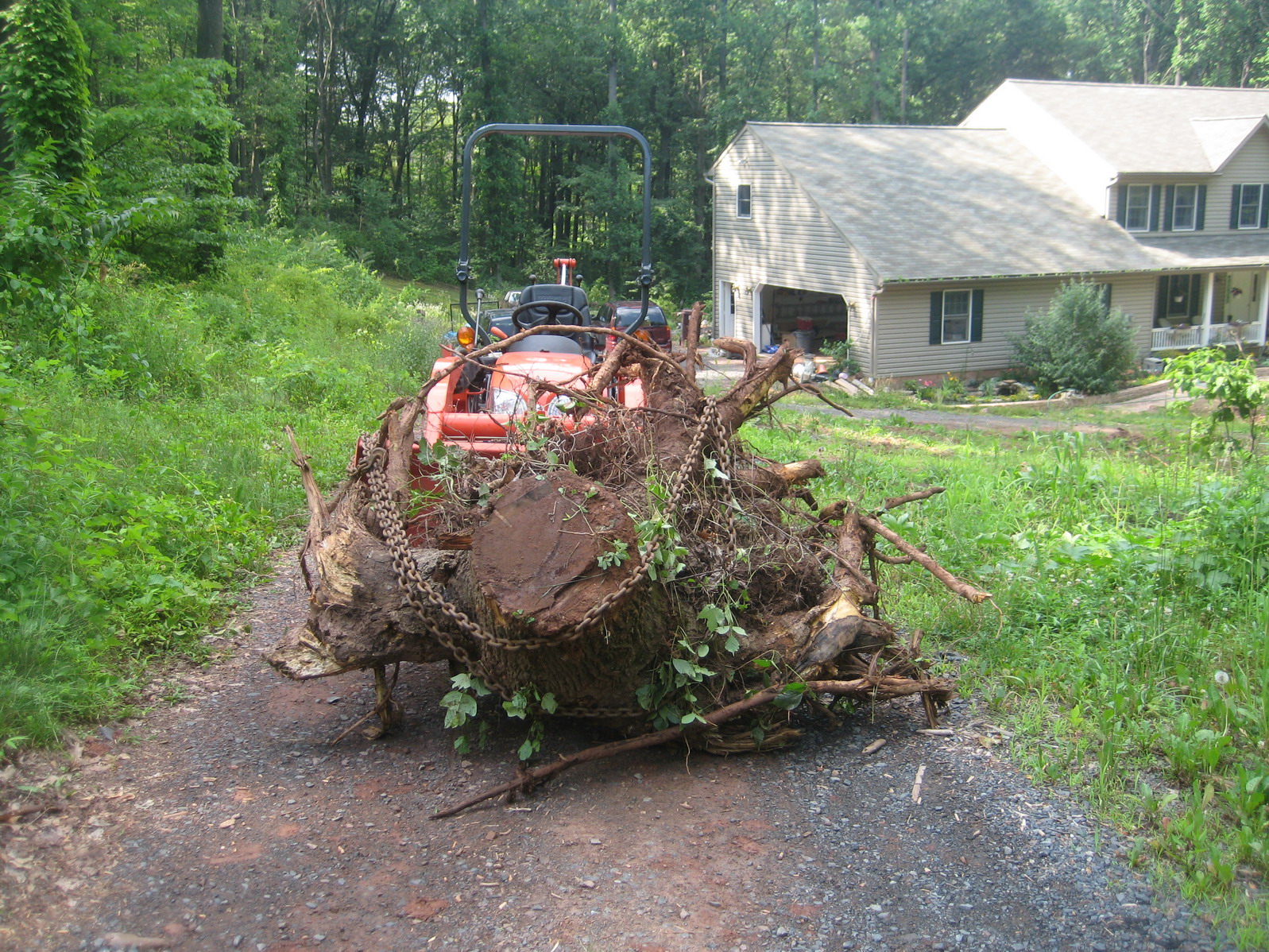 If it wasn't for RayCo's post awhile back, showing the large stump he moved with his tractor, I probably wouldn't have tried moving this stump with the FEL. It looked too large to me for my small tractor but once I got it in position and strapped up, the FEL picked it up with no problems.