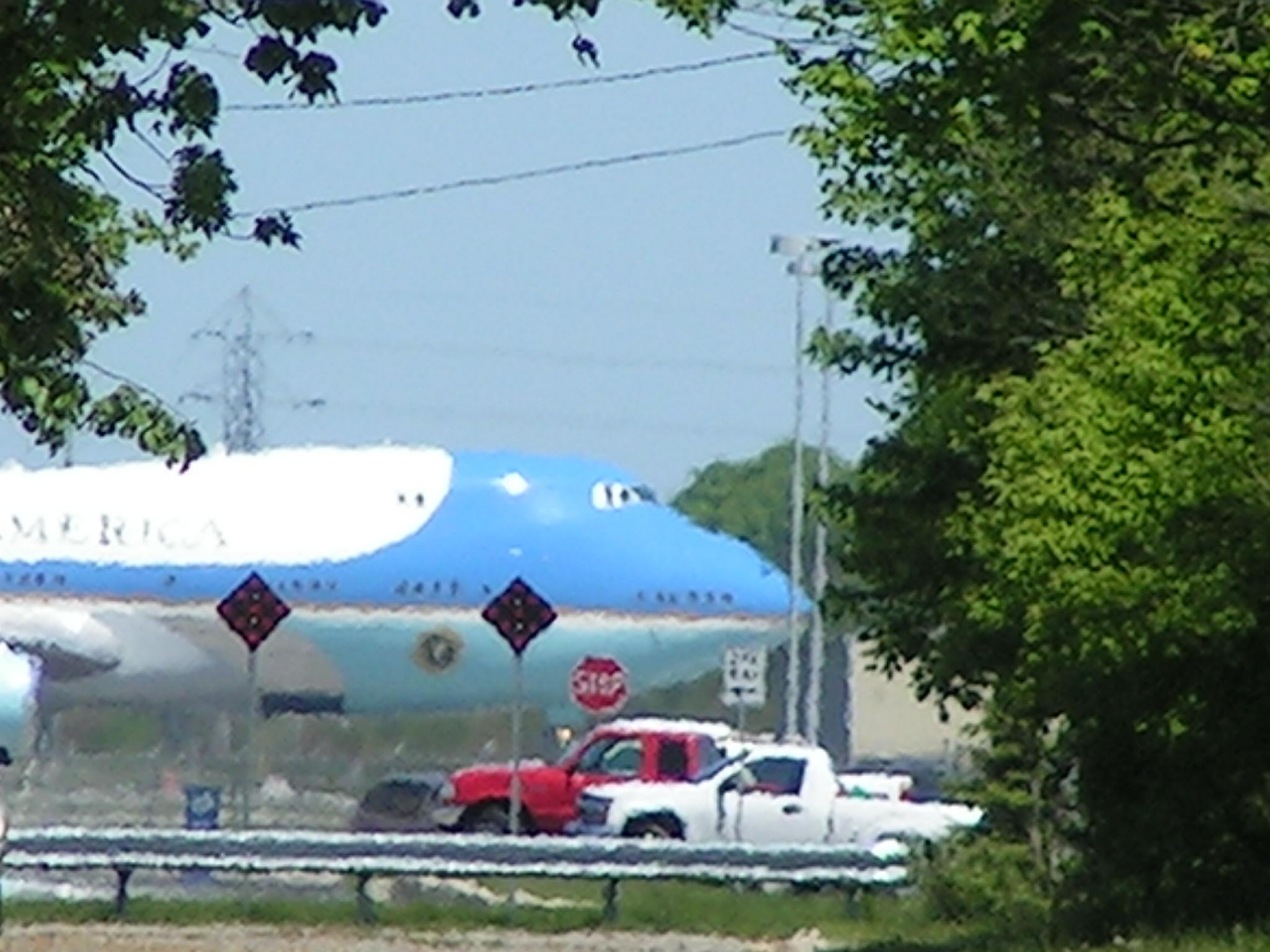 Air Force 1 landing on runway 27L in South Bend, Indiana, then taxiing back east to the terminal. The photos have a lot of heat distortion, as it is a tad over a mile away.
