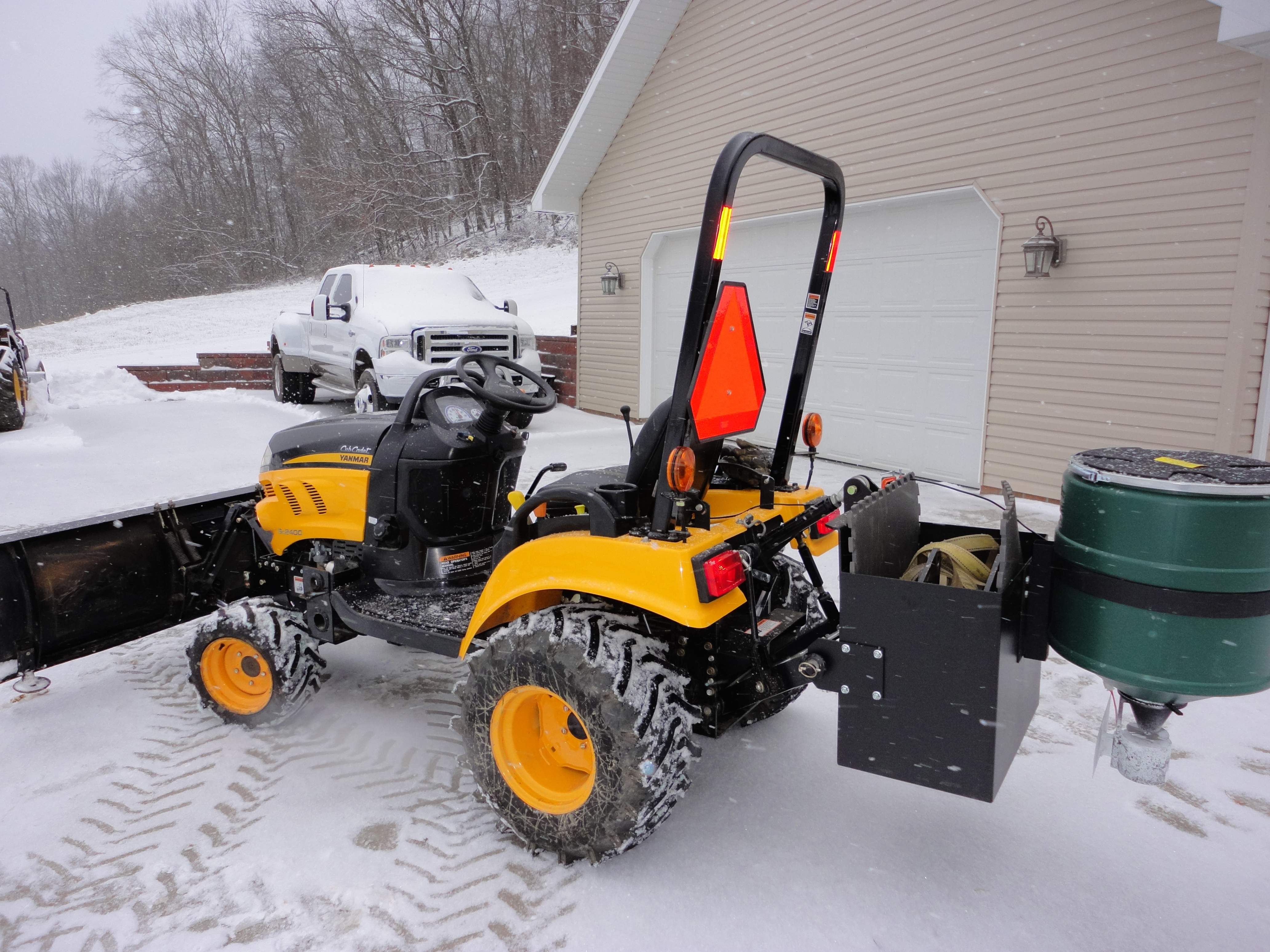 tried it all out yesterday, works great! I've got a very steep driveway, after a few trips spinning tires coming back up, it got SLICK.......so loaded up the salt, and used the spreader...worked like magic. The tractor usually takes a 5' blade, but I mounted a 6'....works like a champ. Really like the rubber cutting edge, like a big squegee. The salt spreader sticks out the back of the rig a bit far, so have to be cautious around buildings.