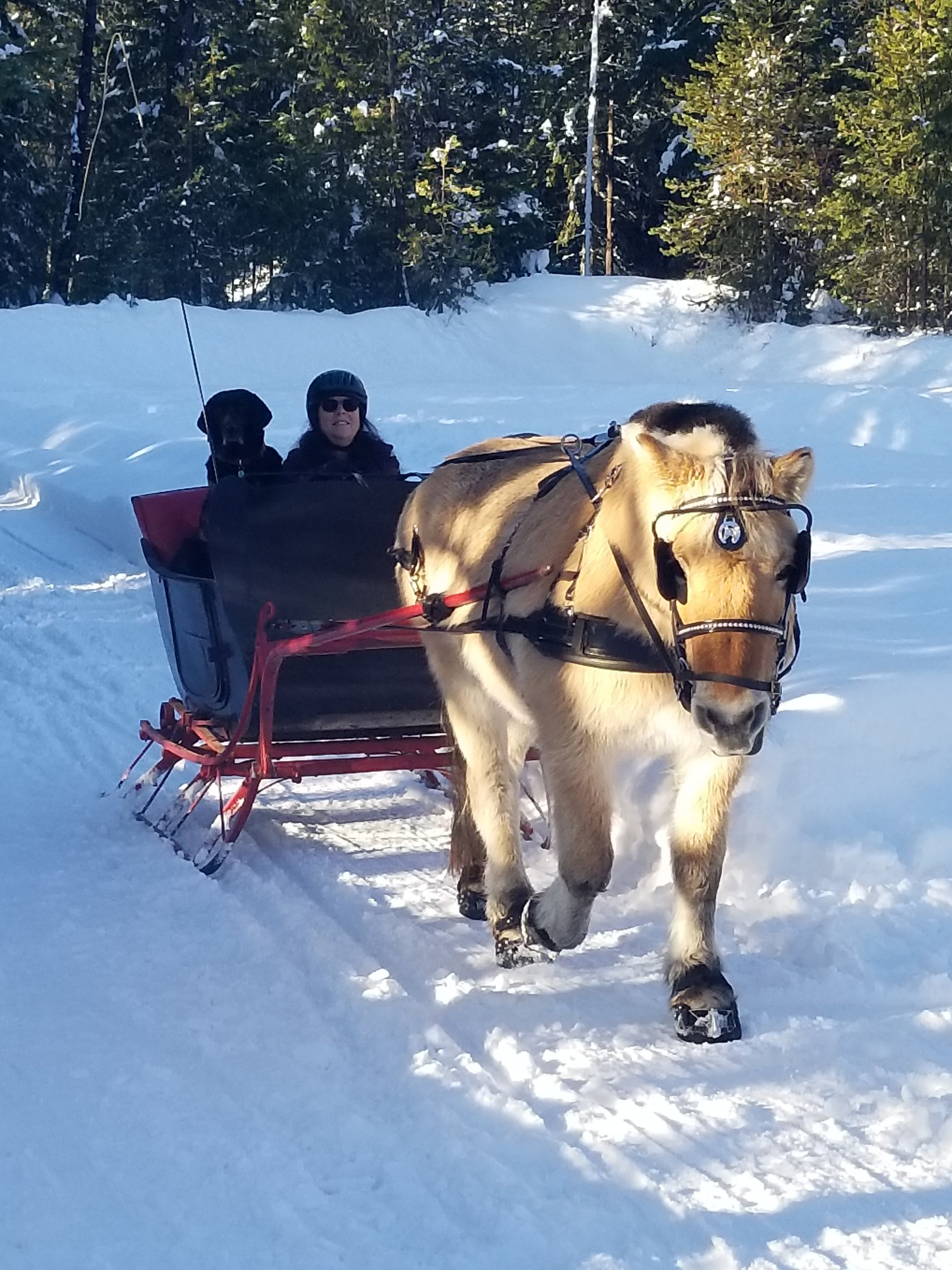 Pretty Fjording horse, one of the oldest breeds from Norway.After 3 days of plowing and blowing snow, had a sunny day, 36°. Time to play. This is my better half and my dog .