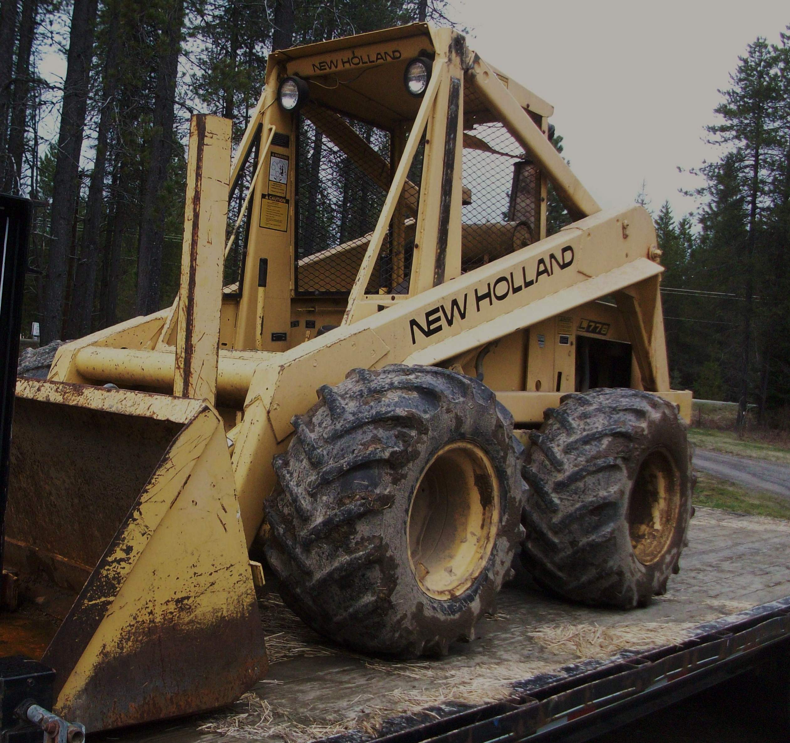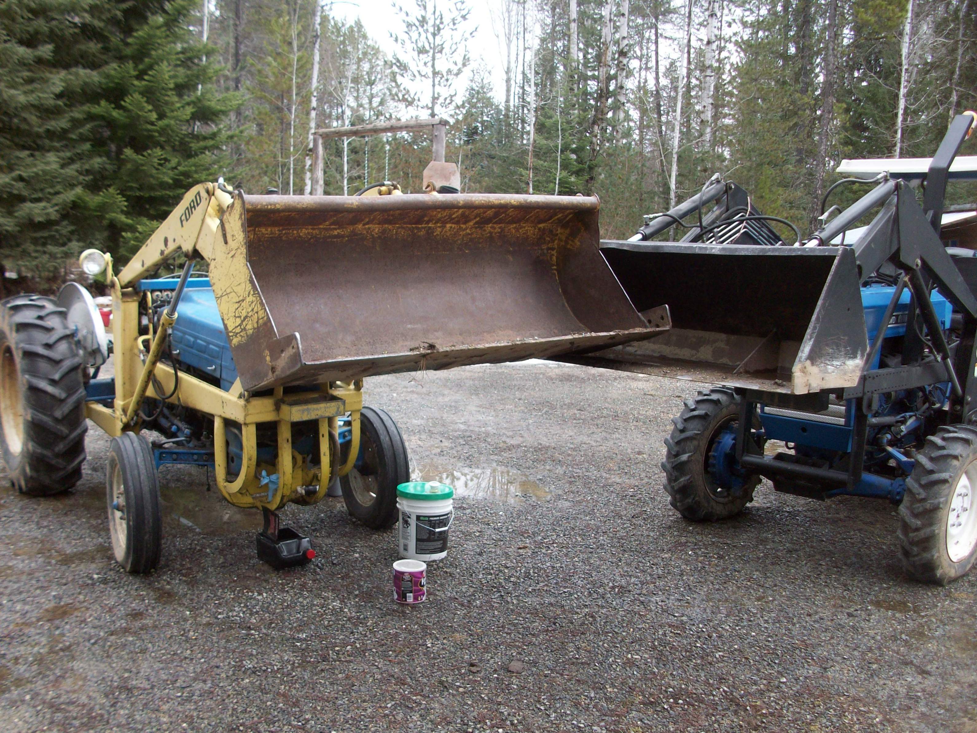 a picture of the Rhino helping the Ford out when the drive coupler for the loader failed on the ford by holding up the bucket so there was some access to the pump