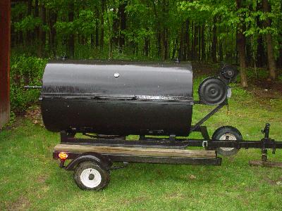 As far as the spit roaster, I found a picture on the internet of one made out of a metal pole welded to a spare tire. A motor turns the wheel using a long fan belt and the pole is suspended to two upright posts using what looks like a u-bolt.