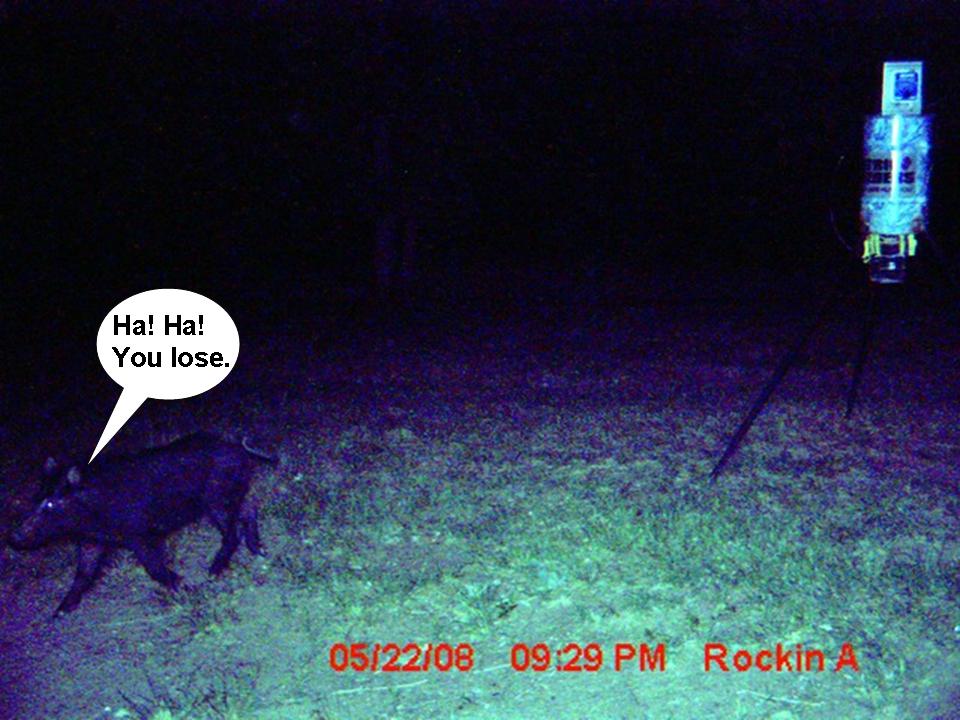 When we had a hog eating the bird seed in our front yard, we tried watching for it every night, but never saw it. Then I got the idea to buy a motion sensor from Walmart. I put it on a chair, then ran a work light to my bedroom window. When the hog walked by the motion sensor, it turned on the light in my window, which woke us up. It took three nights to figure out a way to get the shot without spooking it, but it kept coming back every night about the same time, so we were able to improve our tacticts.