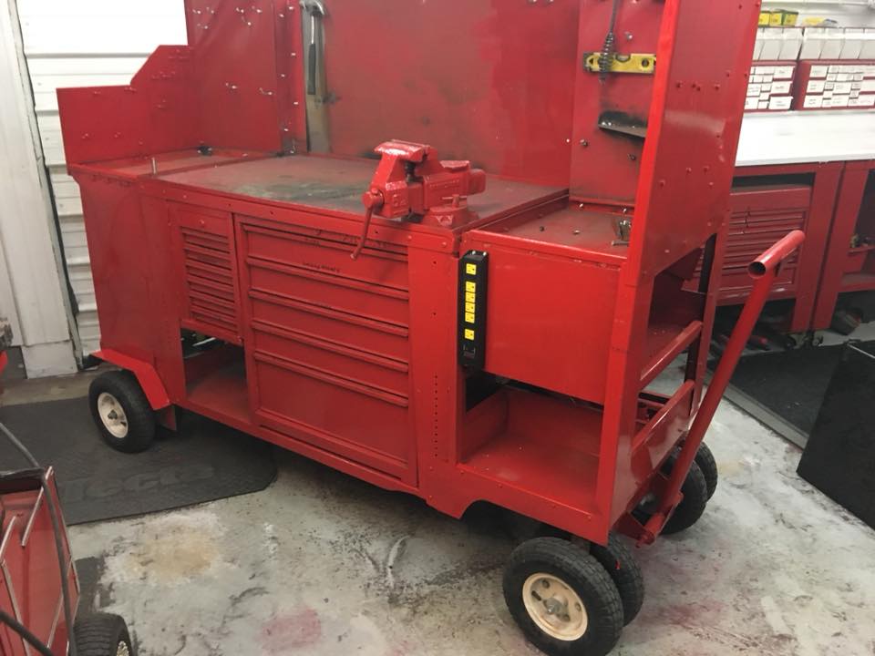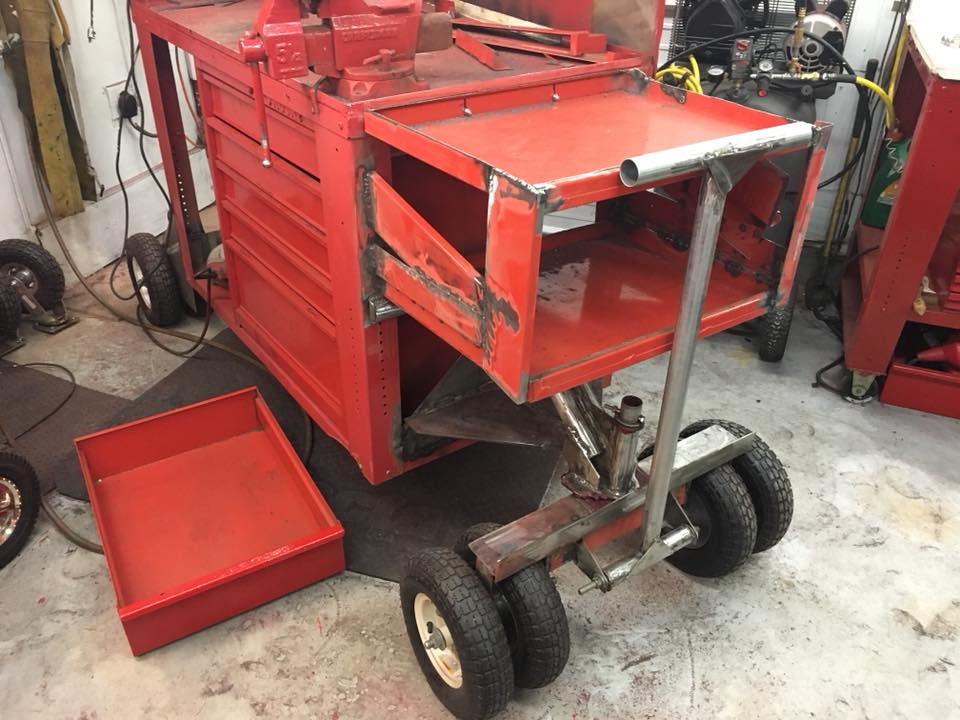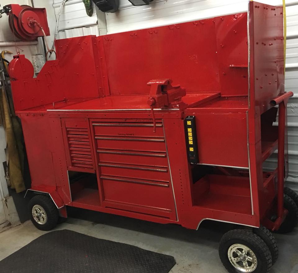 Looking much better today , got the front fender well done, the rear fender attached, the rear corner sheet metal on, then boxed in the small drawers. Got out the red paint and started painting but ran out of paint. Very pleased how all three rolling tables have turned out. Going to actually be fun pulling them out on the days I need room and pull garden tractor inside the little workshop.fenders.jpg