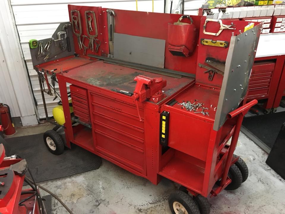Made it to the shop today and now you can see the extended work surface. I redid the end splatter shields to hold vise grips, clamps, squares, etc. on each end. I added a small set of drawers next to the bottom chest after building a frame to support it. Now Im working on the rear lower frame work to hold the portable air tank. Going to be so much nicer working on it . Still looks rough but paint day is getting close.longer table.jpg