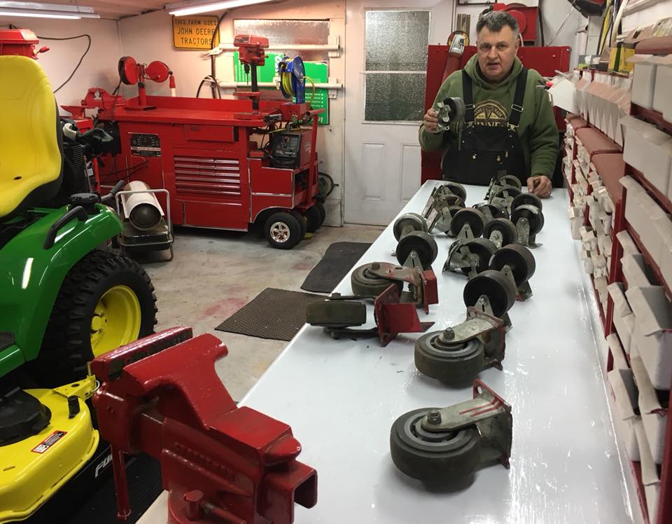 There is always one garden tractor in the workshop on the lift. Always another garden tractor in the front garage too. The rest are in the back shed or out back. I'm done buying garden tractors !!! Ran out of room !!, ha,ha. Today I finished up painting rolling workbench no. 3 I added the fancy little wheel covers and added a little chrome trim. These were three fun projects and going to make it more fun working in the shop. mag wheels third table.jpg