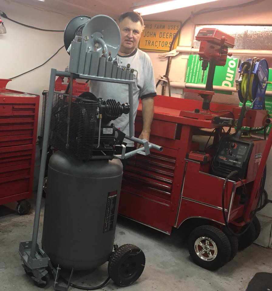 Today shows the progress on tweaking the little air compressor. It was just too hard to move around. I got the front duel swivel wheels mounted and a new more user friendly handle with some extra hooks for accesseries. Now I am starting to fabricate a upper shelf for a hose reel. It already moves around 100% better. I will be able to move it from the shop to the front garage and even out in the driveway if needed. Looks at the rough stage yet but once its done and all painted grey it will look nice.;)hose reel.jpg