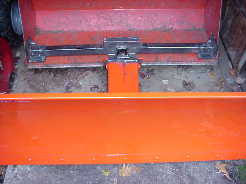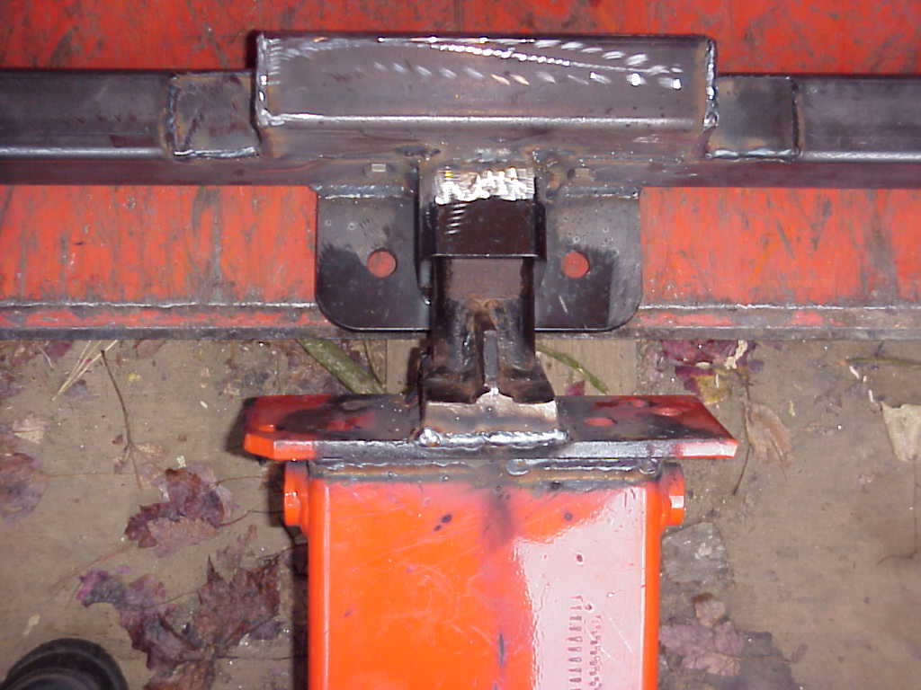 Here the set up in the bucket. I Made the frame using a step hitch and 2" square steel. the hitch I cut the bolt hole off and mouted it so it hangs down below the bucket. so when I plow the piece hang below the bucket edge is up against the front edge of the bucket doing all the work.