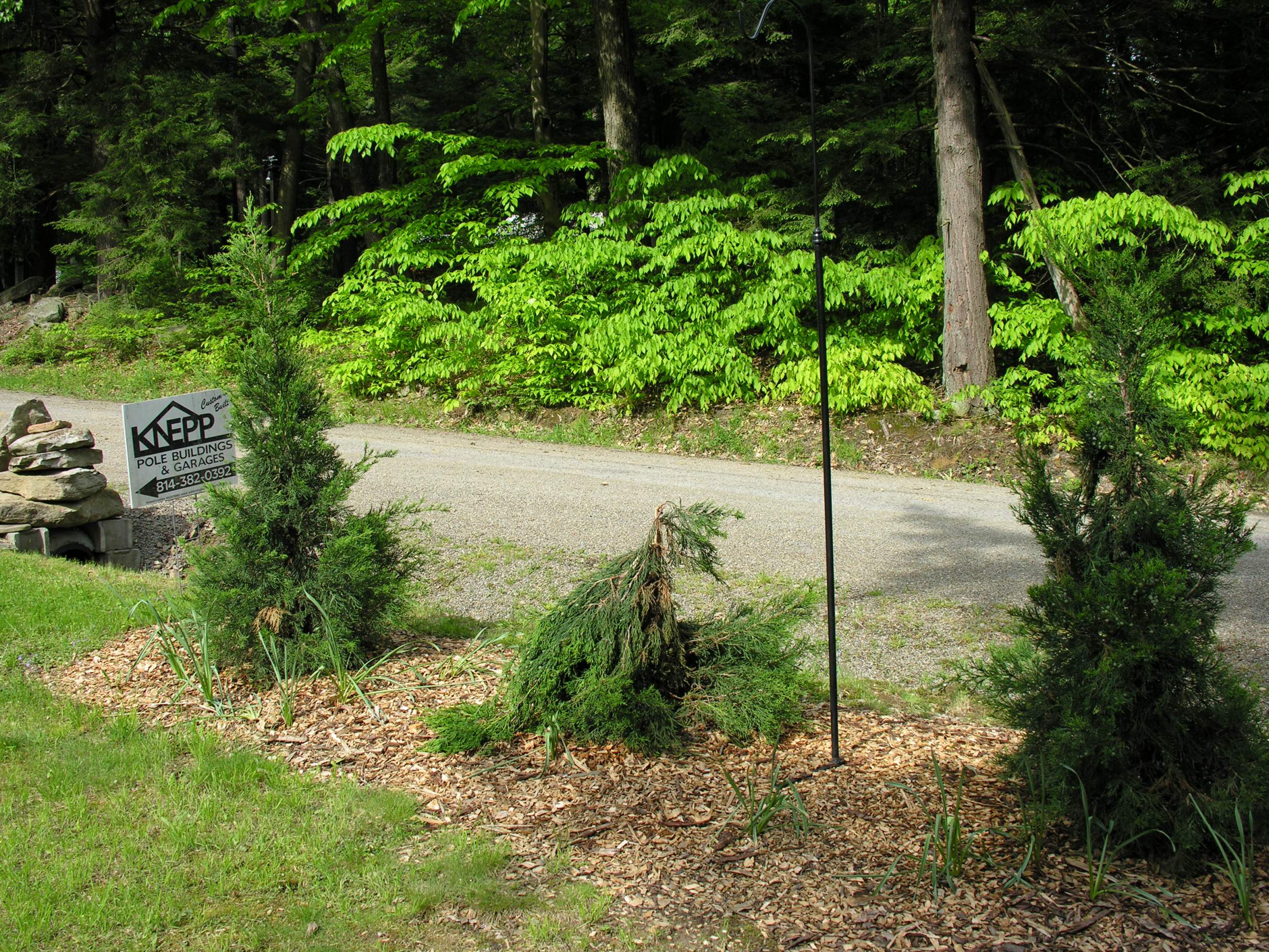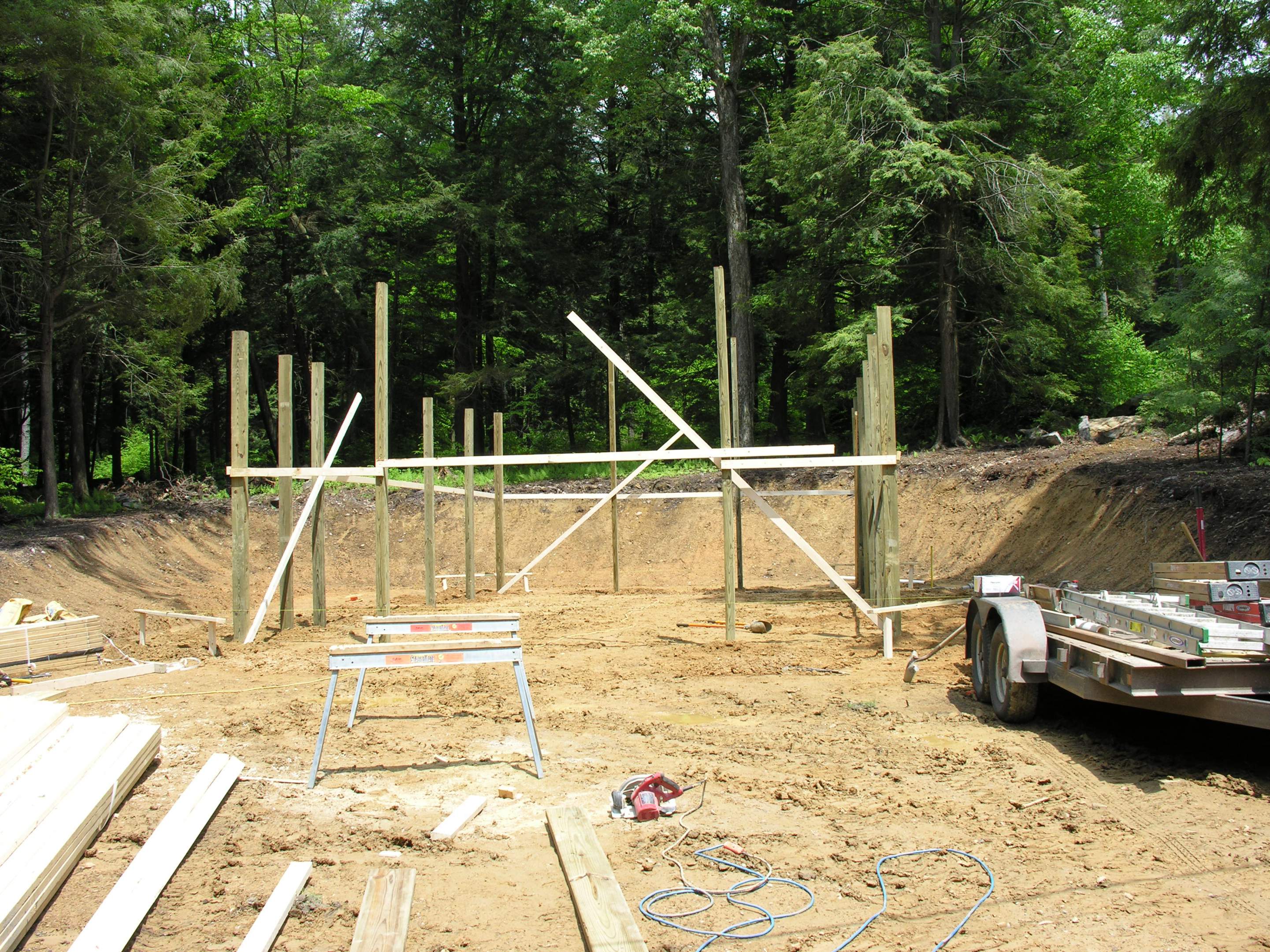 Well the long awaited barn got off to a great start today. What you see was done in about 7 hours. There have been some chnages since this thread was started. It is now 24' X 40' but no-lean to. Adding the lean-to counted toward square footage of the building and by going over 1000 sq. ft. the building permit would have gone from $10.00 to "several hundred" and I would had to file a storm water plan. We will build this now and plan another open shed later instead of the lean-to. Also the overhead door will be 12' X 9'. And Mr. Bear came back and finished off our conical juniper.