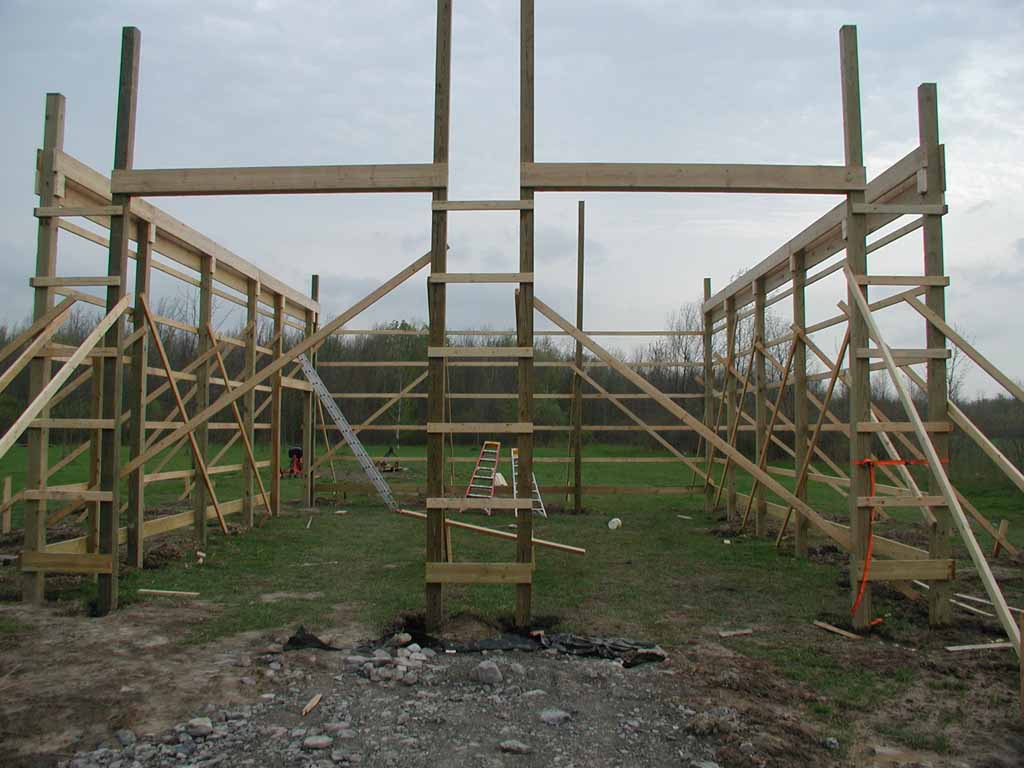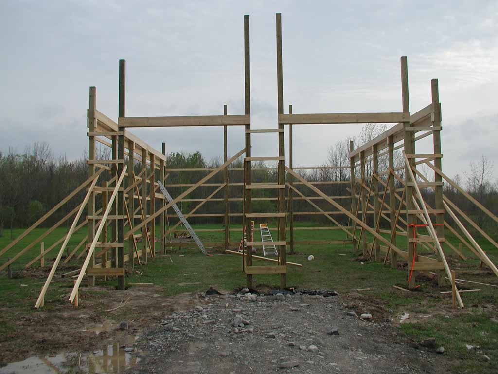 The next purlin should go on before the third truss is installed. Attach it to the two trusses in place. The purlin will hang out to where the third truss will be located. This should make setting the trusses a little easier too. Maybe. LOL