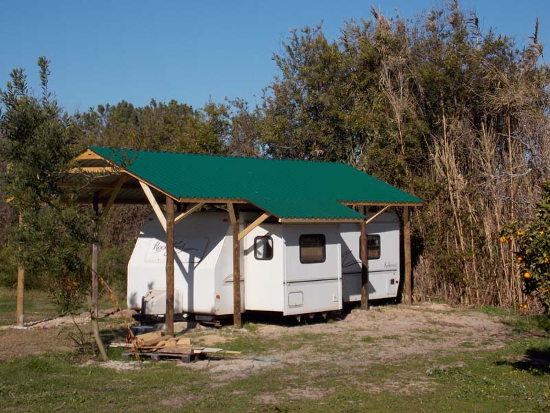 This is an open RV shelter, with a clear view of the Atlantic ocean. We get some pretty hard wind; so far, no movement. I used a lot of screws, all stainless, and lots of triangulation.