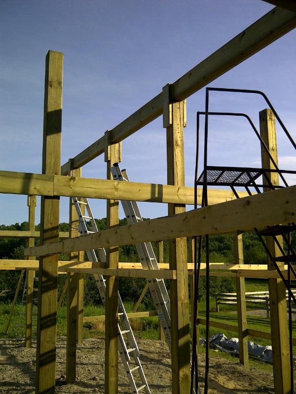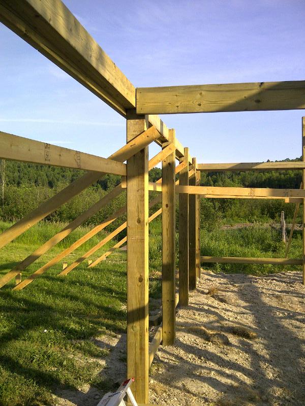Hi Folks, here area few pics of my in progress project, my son (13) and I are building it. Thanks to all the good folks here for the tips on putting up the ridge beam, we got it up (amongs other things) this weekend with no trouble by building in place. We made "saddles" at the top of the 12' posts to hold the ridge beam.