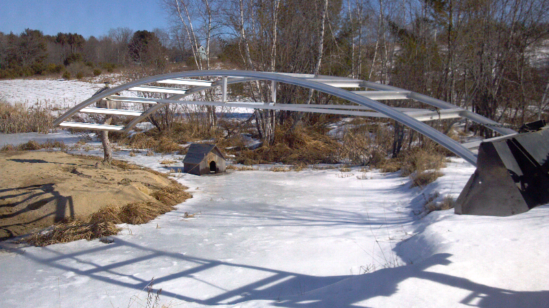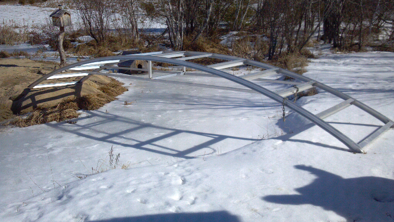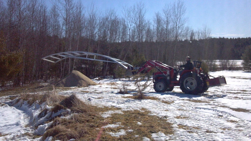 Here are some shots of the frame being set in place. It's just going to rest there till spring thaw. It has 3' of crown as shown. The two ends will be burried at least a foot into the earth.