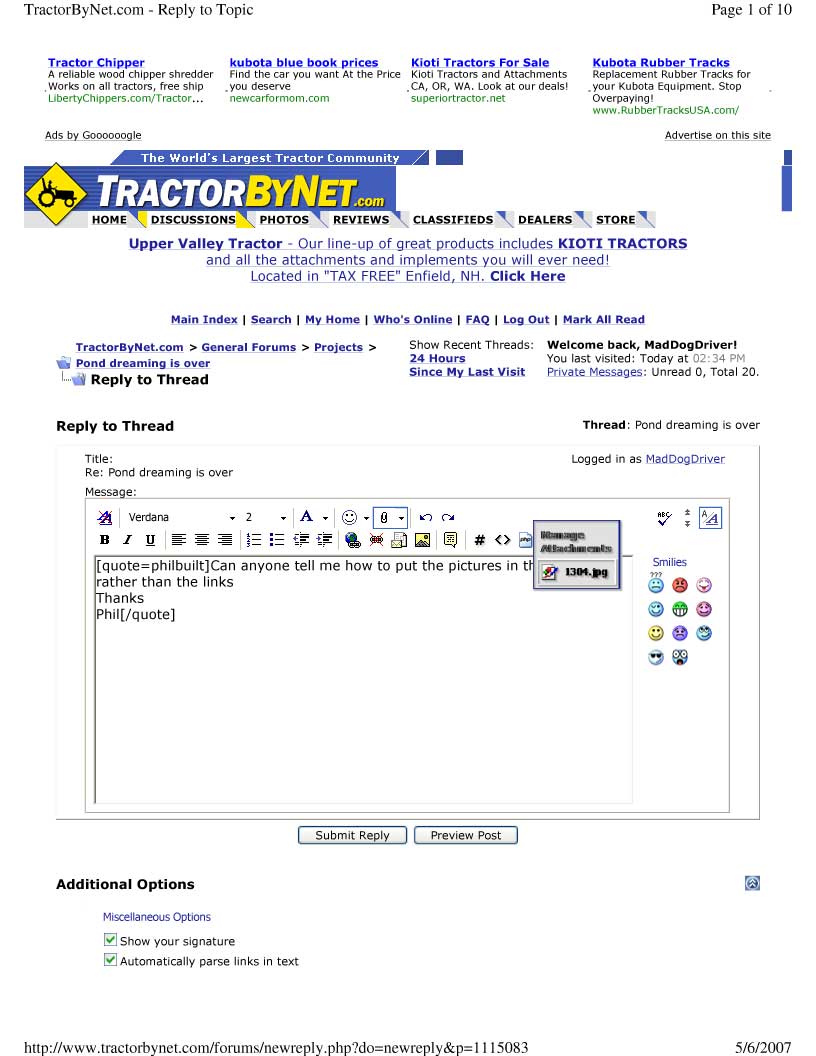 Click on the title of the photo you want to automatically post and you will see "ATTACH # /ATTACH" appear in your text. That is where that photo will appear in your post. I think one of the reasons TBN has the photo insert option as links rather than automatically posting is for those that are on dial-up. The post will load faster for them if the photos sizes are small or they're available as links. For those of us that are fortunate enough to finally have hi-speed internet, it wont' matter.