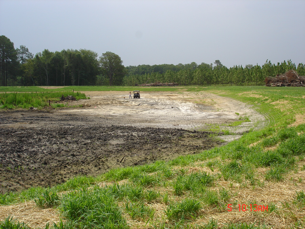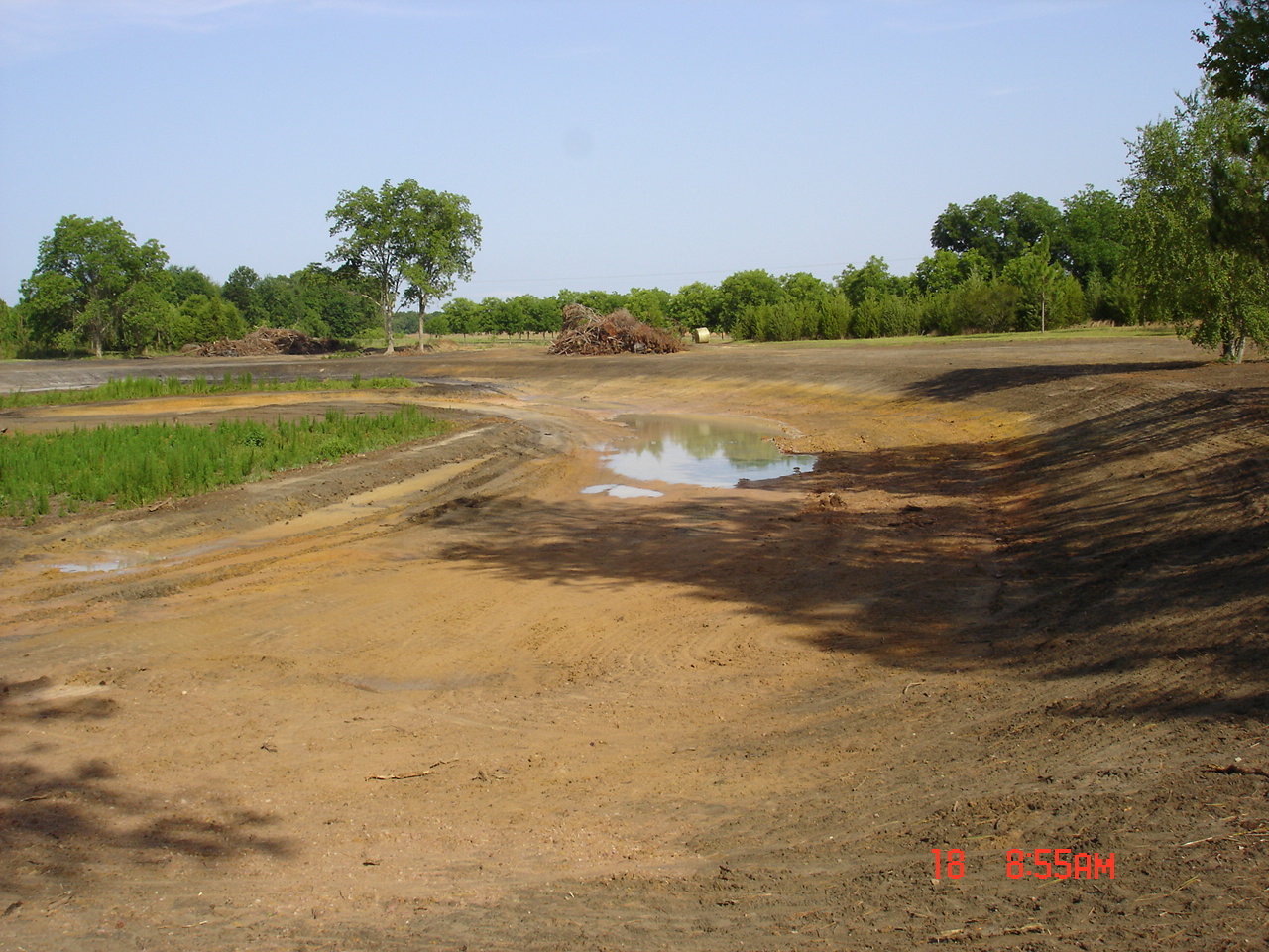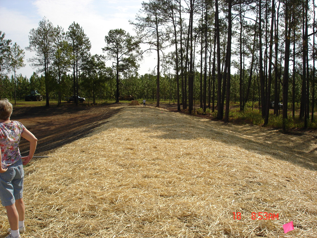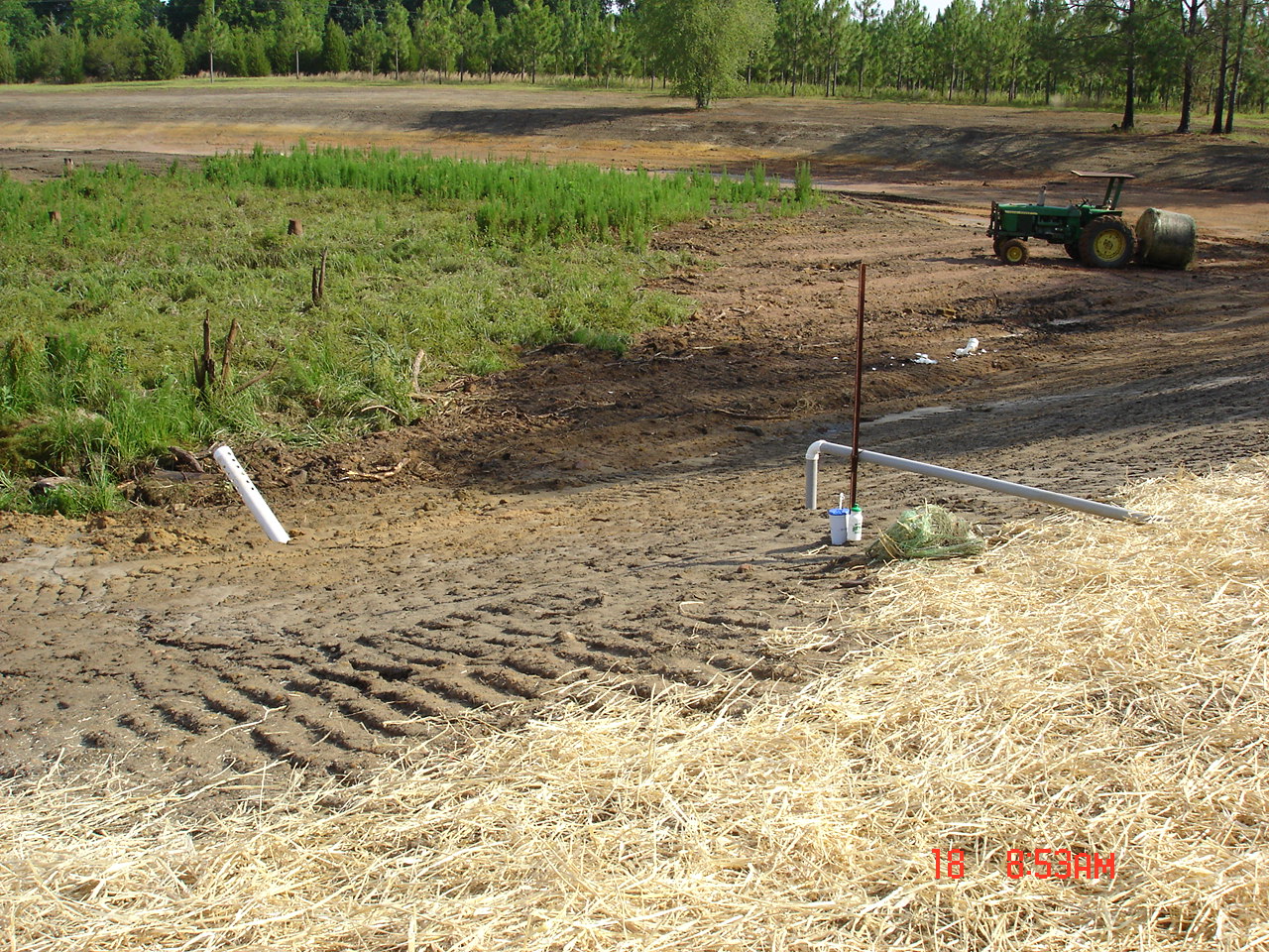 I went back 2 days late on the 18th of June. Straw was being scattered out. 1,000 lbs./acre of lime had been spread in and around the pond. Also, 100 lbs./acre of balanced fertilizer was spread around the pond and brown top millet and common Bermuda had been drilled.