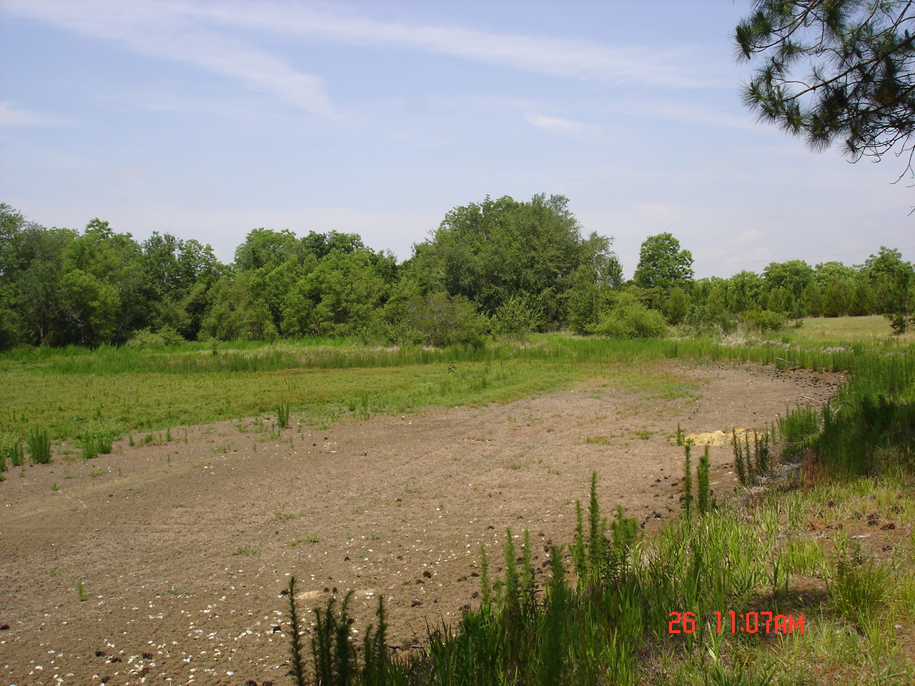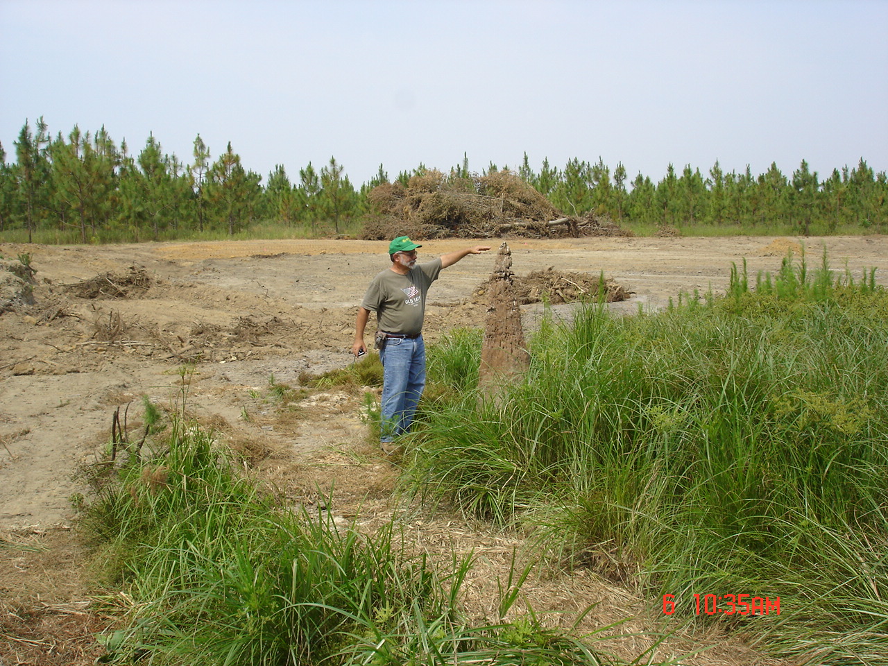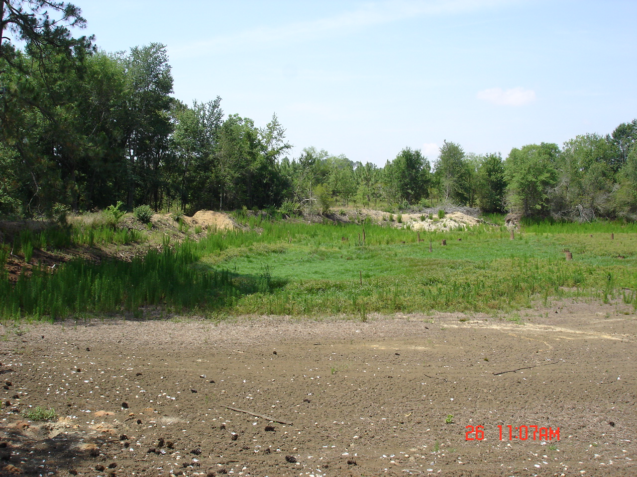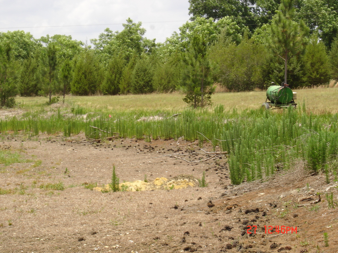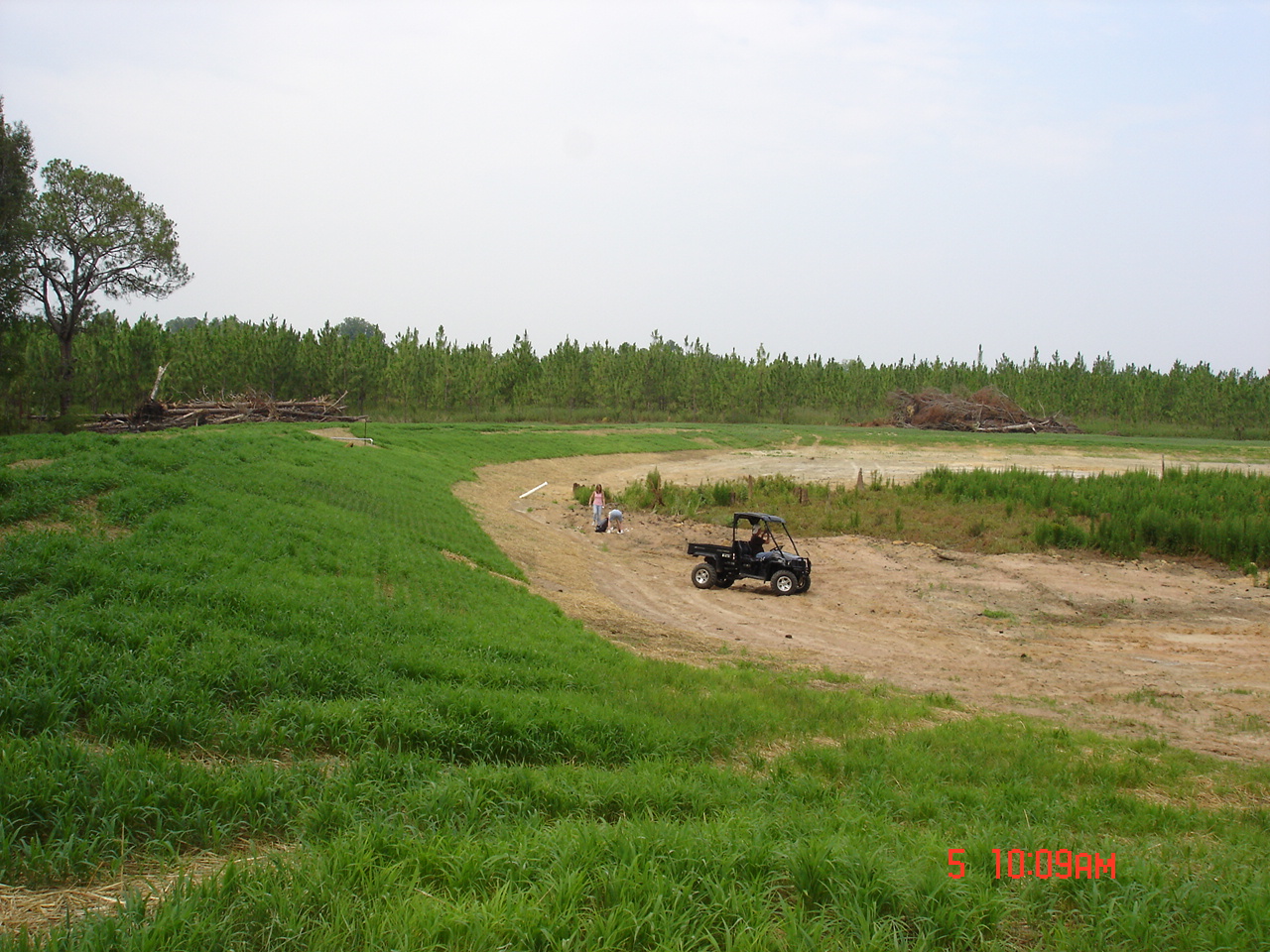 I went back 2 days late on the 18th of June. Straw was being scattered out. 1,000 lbs./acre of lime had been spread in and around the pond. Also, 100 lbs./acre of balanced fertilizer was spread around the pond and brown top millet and common Bermuda had been drilled.