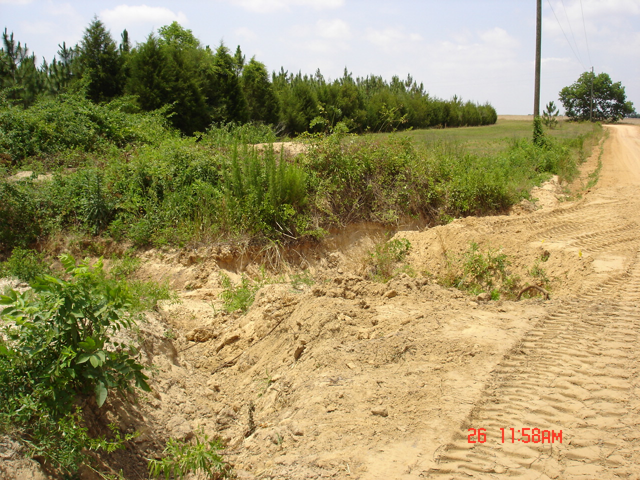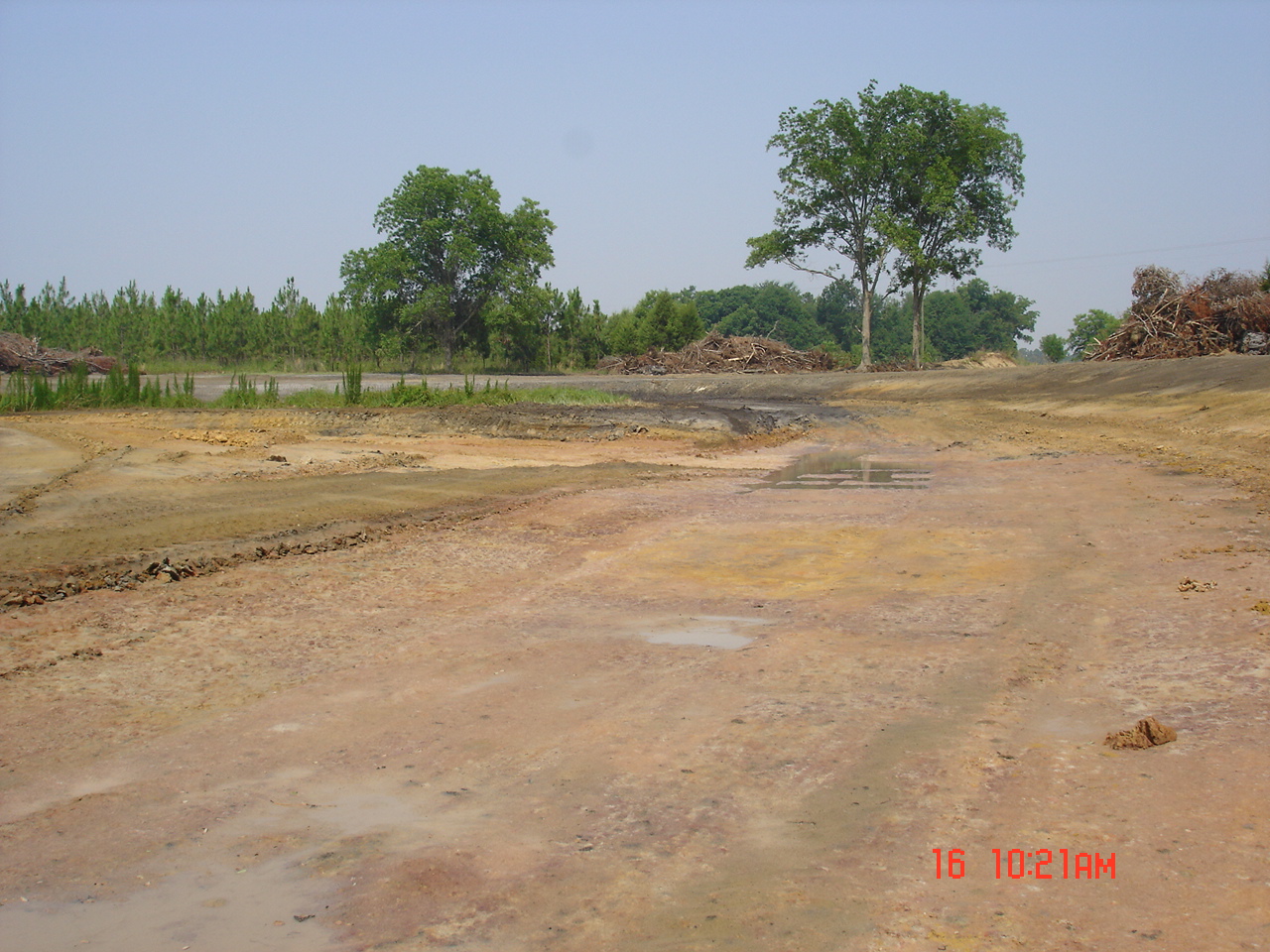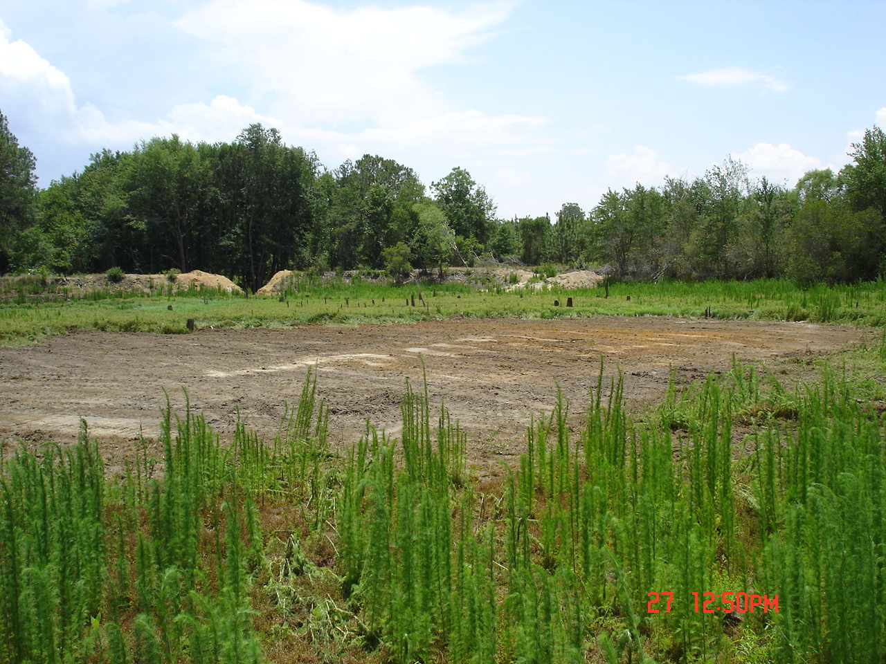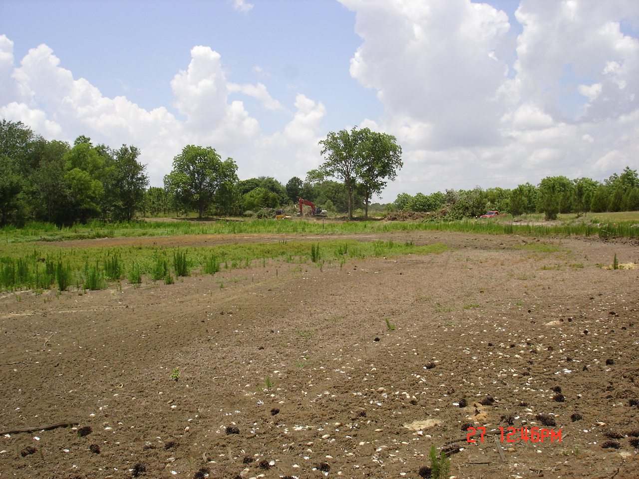 I went back 2 days late on the 18th of June. Straw was being scattered out. 1,000 lbs./acre of lime had been spread in and around the pond. Also, 100 lbs./acre of balanced fertilizer was spread around the pond and brown top millet and common Bermuda had been drilled.
