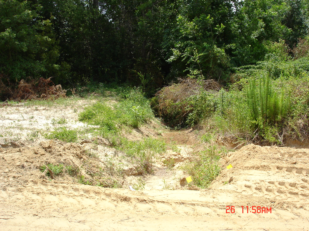 The first is of the old spillway. He said he was going to have to rebuild it. The top of the pink flags will be the high water mark.