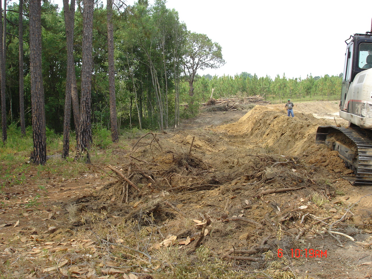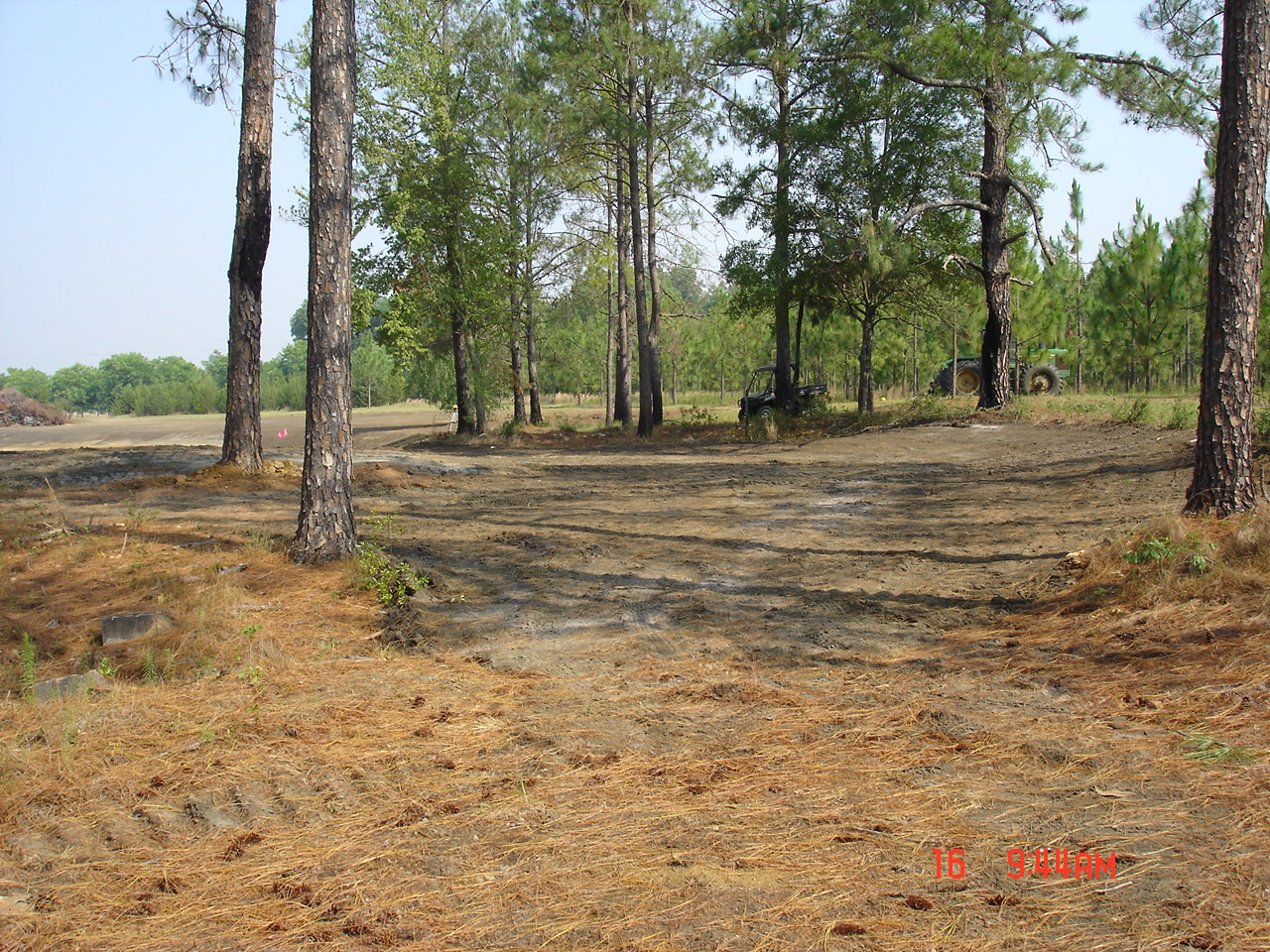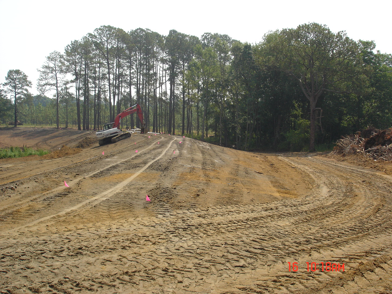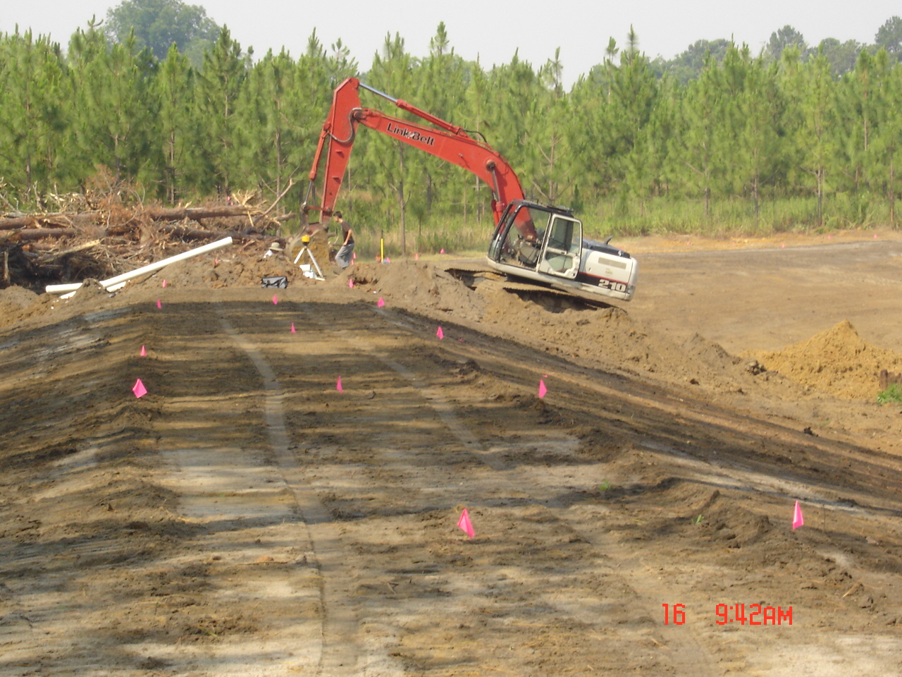 So Friday morning I was at home doing my thing when Stan called. He asked me to come right over since he had the north end and part of the west side cleared. He also had the water line staked on the east, north, and part of the west sides. DW volunteered to go to keep me company.