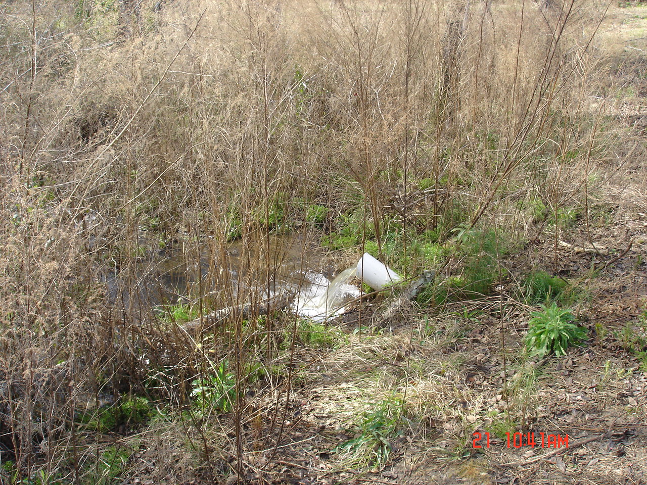 Greg, the neighbor, called Michele last Monday morning and told her the pond was beyond full after the 9 inches of rain we had last week (through Sunday). He sent her a few pictures that he took Monday morning. The following picture shows the water coming out of the overflow pipe.