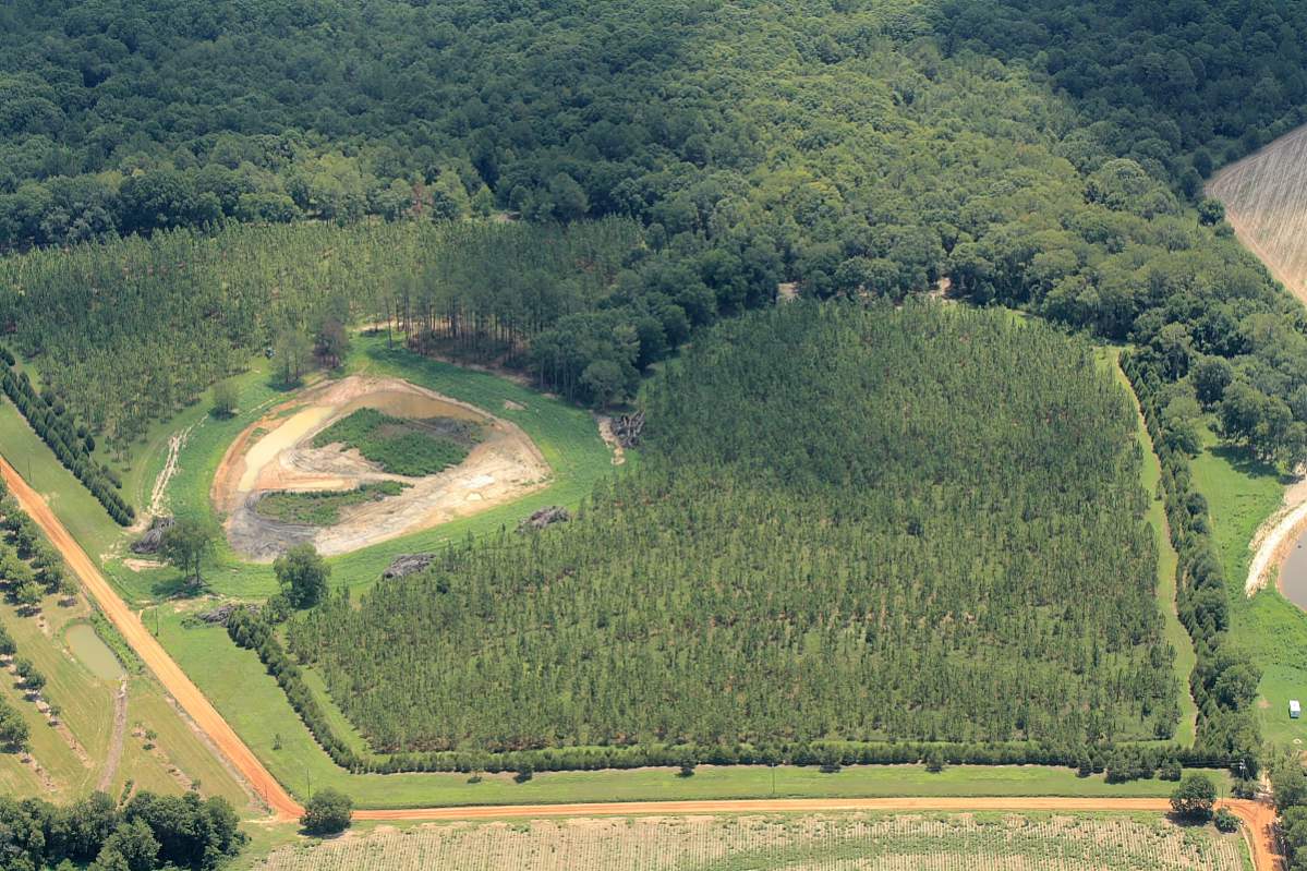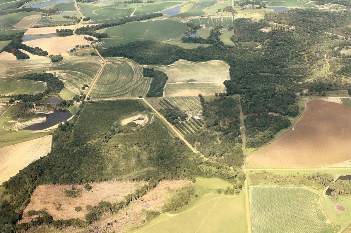 A friend of Michele's just happened to be flying by and took some pictures of the property. There is some water in the new pond. The road at the bottom of the first picture runs almost true north to south. The southern property line is to the right of the mowing lane, row of cedars then a thin row of native trees. It's a straight line on through the hardwood bottoms. The new dam is close to the center of the picture.