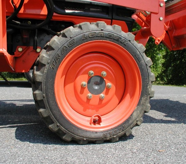 Now the Kubota w/ RFM and R4's. When it was delivered, the ride was so stiff it was like having wooden tires. I don't remember what the pressure was when the tractor was delivered, but the R4's have a certain stiffness or sidewall strength that the R1's don't. Airing down to 10# in all 4 tires when I added 15 gallons of antifreeze to the rears really improved the ride. I posted a pic a while back (see attachment) taken with a load of topsoil in the FEL. Tractor was on blacktop, and there was a fair but not excessive deflection of the sidewalls. As you can see, there is a lot of wheel and not much sidewall on the front tires.