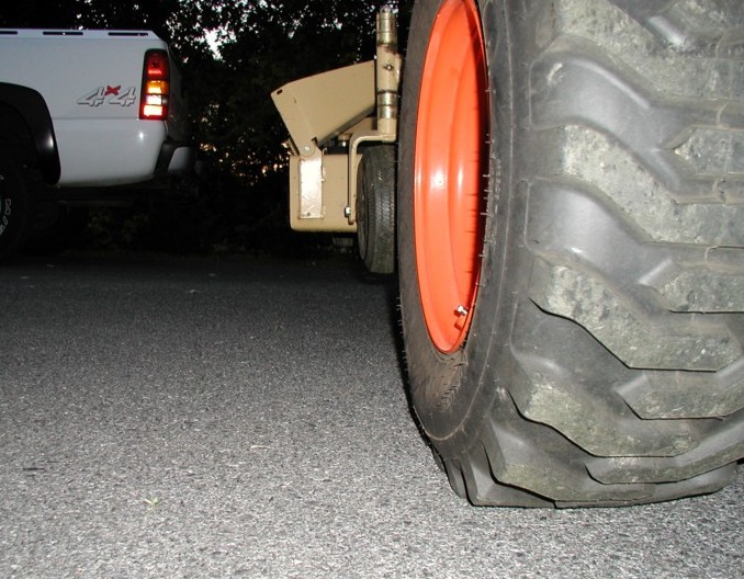 It looks like 7# is still more than needed if you note the sidewalls of the tires. The attached photo is the right rear tire last night with 7# and the (rather beefy) Landpride RFM is hoisted to apply weight. I may drop to 5# just to see if the sidewalls start to flex, but the 7# gives me acceptable comfort...............chim