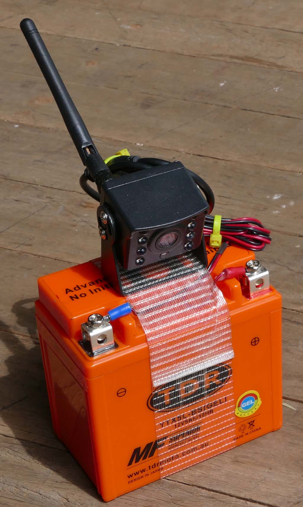I set up my camera system a few weeks ago (before I saw the clever magnetic mounting idea), and I'm using an inexpensive wifi reversing camera sitting on top of a 5Ah gel battery. The camera is for an Android app called W-Car, and I have a Samsung S6 clamped in a suction-cup mount off the windscreen.
