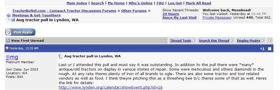 I have developed a ritual now (hope I spelled that right). I visit TBN and click on a thread, then leave and click on the same thread again. If the second time I come back to the first post in the thread previously visited, I just throw in the towel an go back outside and do tractor stuff!
