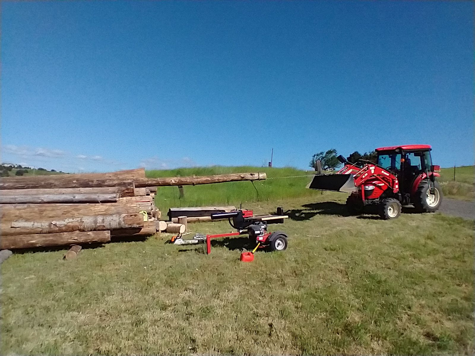 Just getting started on cutting up and splitting 12 cords of firewood from a load of logs that were just delivered. I plan on pulling the logs out a ways individually from the stack with the tractor so they can be bucked easily while cantilevered off the ground.