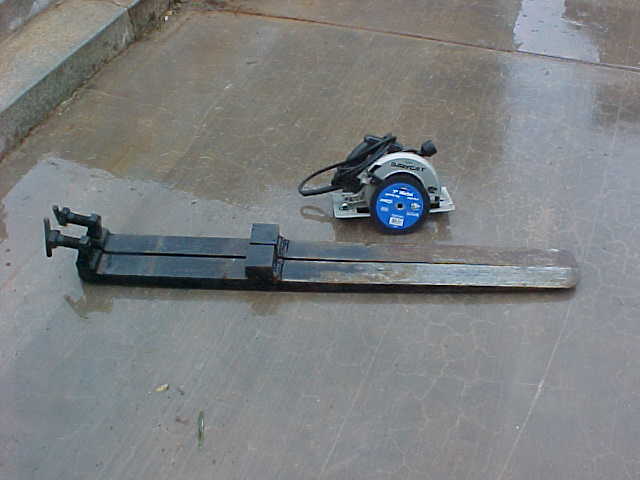 To split the fork I used my trusty circular saw with a metal cutting abrasive blade . The blades come in 7-7 1/4" sizes which fit a circular saw perfectly (blade leaning against saw). Just clamp an upright 1x4 along one edge of the fork to use as a fence. Use a piece of wood as a spacer between the saw and fence to center the saw blade and away you go. Tiip: Check the blade for squareness to the base of the saw frequently to assure a perpendicular cut. Another Tip: Very shallow cuts work best.