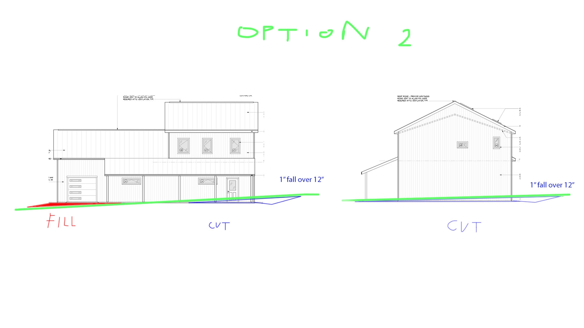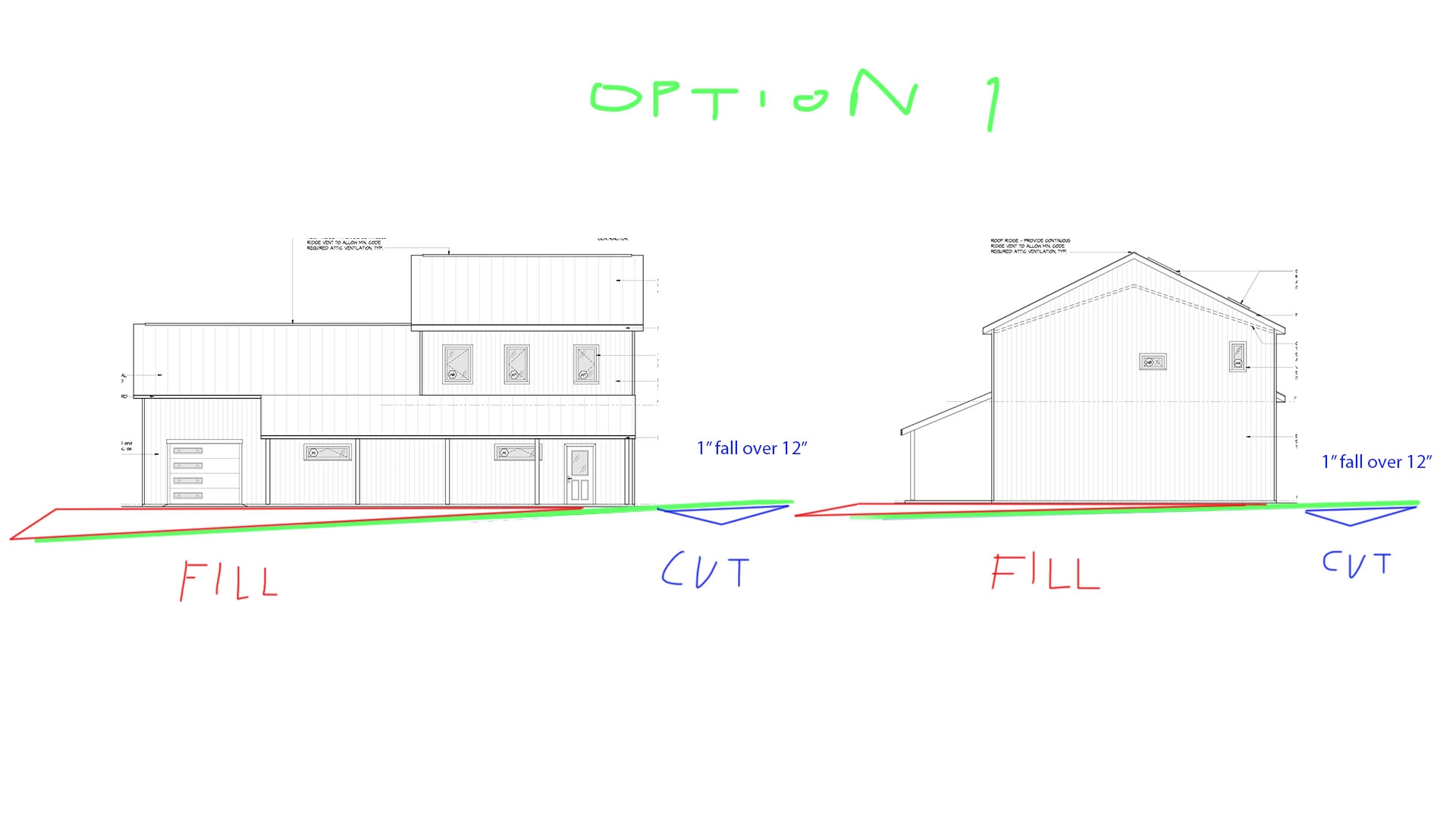 Option 1) is probably the better way to go to keep water away from the building. It looks like I will have to cut a little swale either way to direct water away from the building, as I'm not at the highest part of the property. Am I thinking about this right? See attached pics below (
