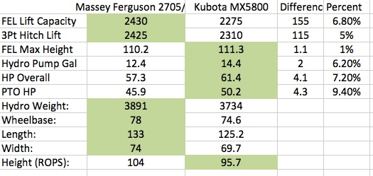 Another number to consider is that the Kubota will have slightly higher PTO HP.
