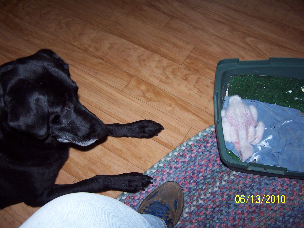 So I resort to my big dog training secret tool a fly swatter. All of my dogs are afraid of the fly swatter. So Zema is on the floor in a 1/2 a dog cage and I sit with fly swatter in hand already giving out a lick for good measure to start out with just to get Sheba on watch. She was always very interested but never did anything she always seemed to very curious.