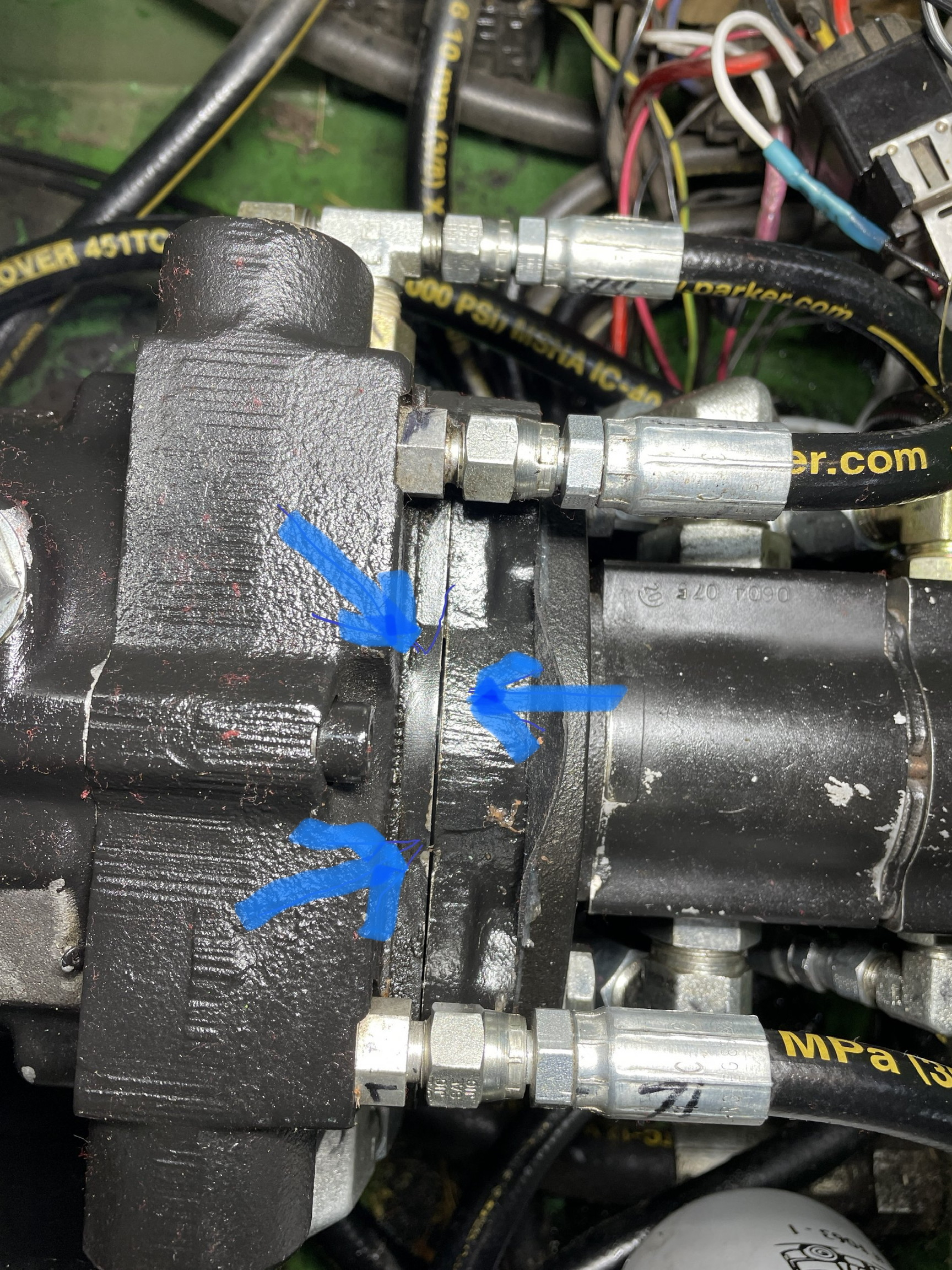 I don't think there is any pressure transfer through the pump sections. That gap shouldn't make a difference. There's a shaft in there that turns the piggy backed pumps, but it should have a seal. I think the tram pump should still work even if the two PTO pumps sections were removed. I could be mistaken, though.