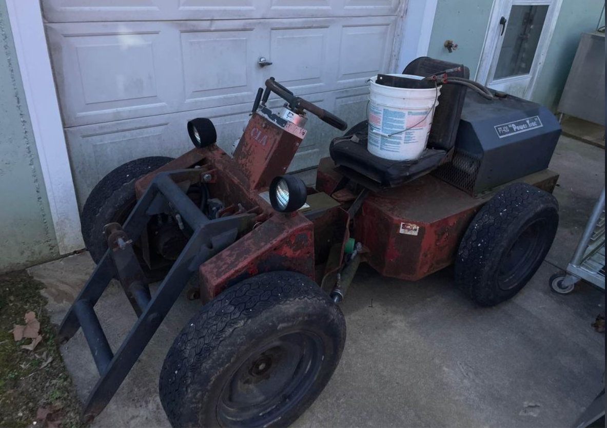 I LOVE THE TIRE SIZE, looks like car tires. For other options, it seems to have a foot control on the right side, maybe that is for the aux hyd? But yet it has one slot cut near where the current hyd control handles go. They used some kind of rotary control valves, likely obsolete. I would bet the seat/frame is standard and just not bolted up, set in place to make it look better. To me the engine looks like an Onan. The frame rails have a wide return at the top. One of two hyd pump sticks out beyond the rear of the machine and has a welded on shield. Somebody rigged up a starter solenoid on the right outside part of the frame with the wire cables getting pinched by the hood.