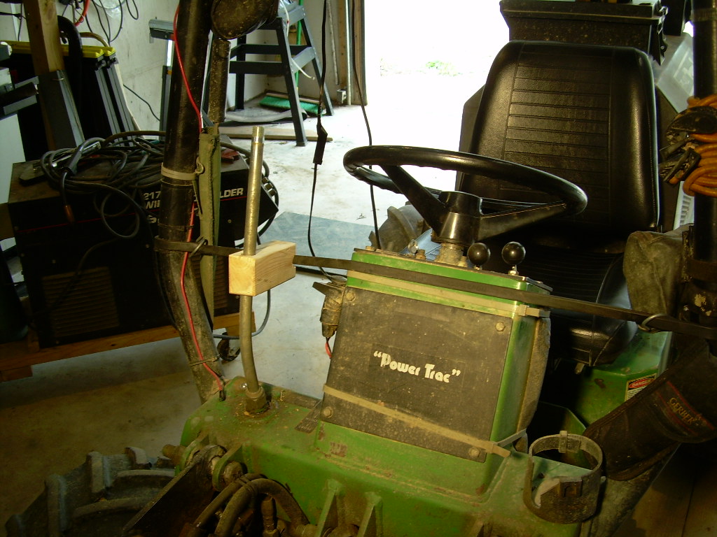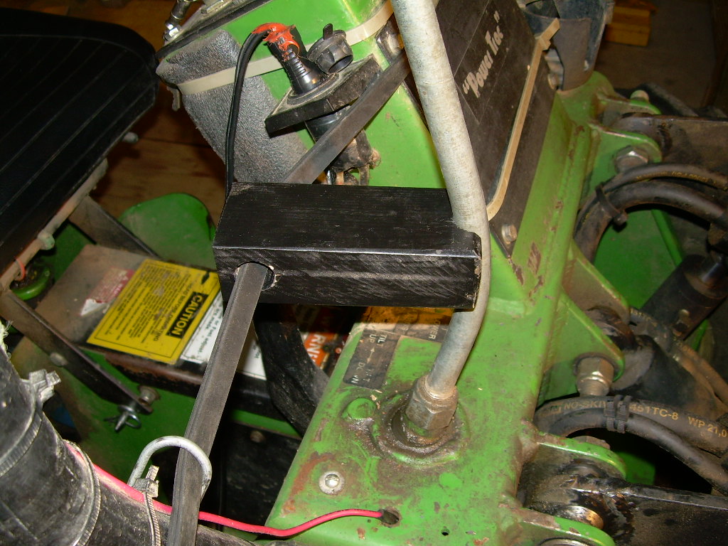 I have been using this modification since April 2007 and it has worked very well. When not being used the block can get in the way a little bit. Today I made a simple change to correct this. I took the end of the block with the hole in it (not the slotted end) and took it off of the control lever. Then I ran the bungee cord through this hole. It was necessary to trim the bungee cord to get it through the hole. Of course I could have enlarged the hole. I tied a wire through the bungee cord and pulled it through the hole. The act of pulling stretched the cord and thinned it out so it went through the hole easier. I can store the block in front of the pedestal when not needed. I have attached two pictures.