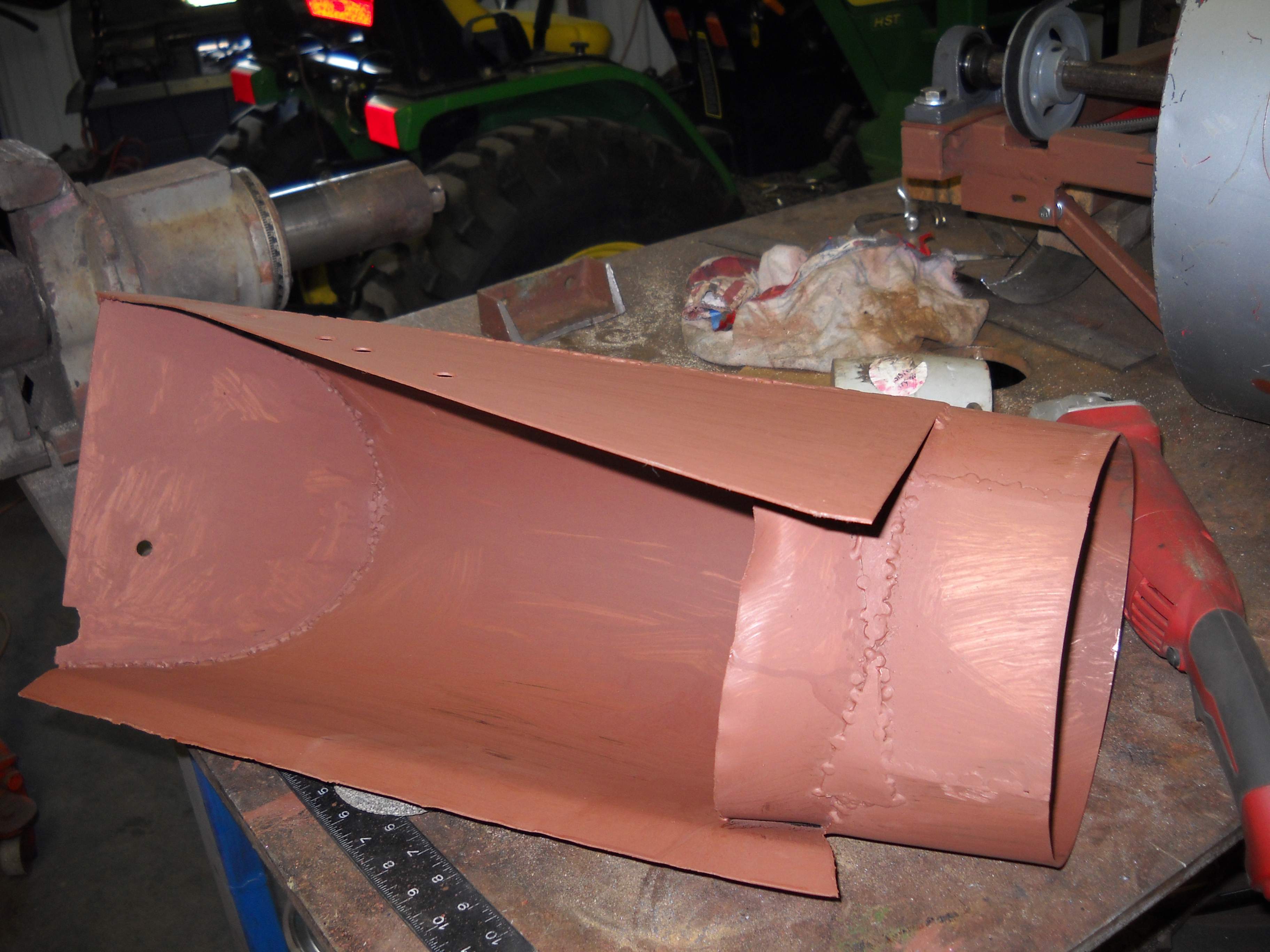Made the transition to blower hose from the mid mounted mower last evening. Used 20 guage material which should be more than adequate for durability. Next a matching 8" collar from the square 5"x5" square fan housing exit.
